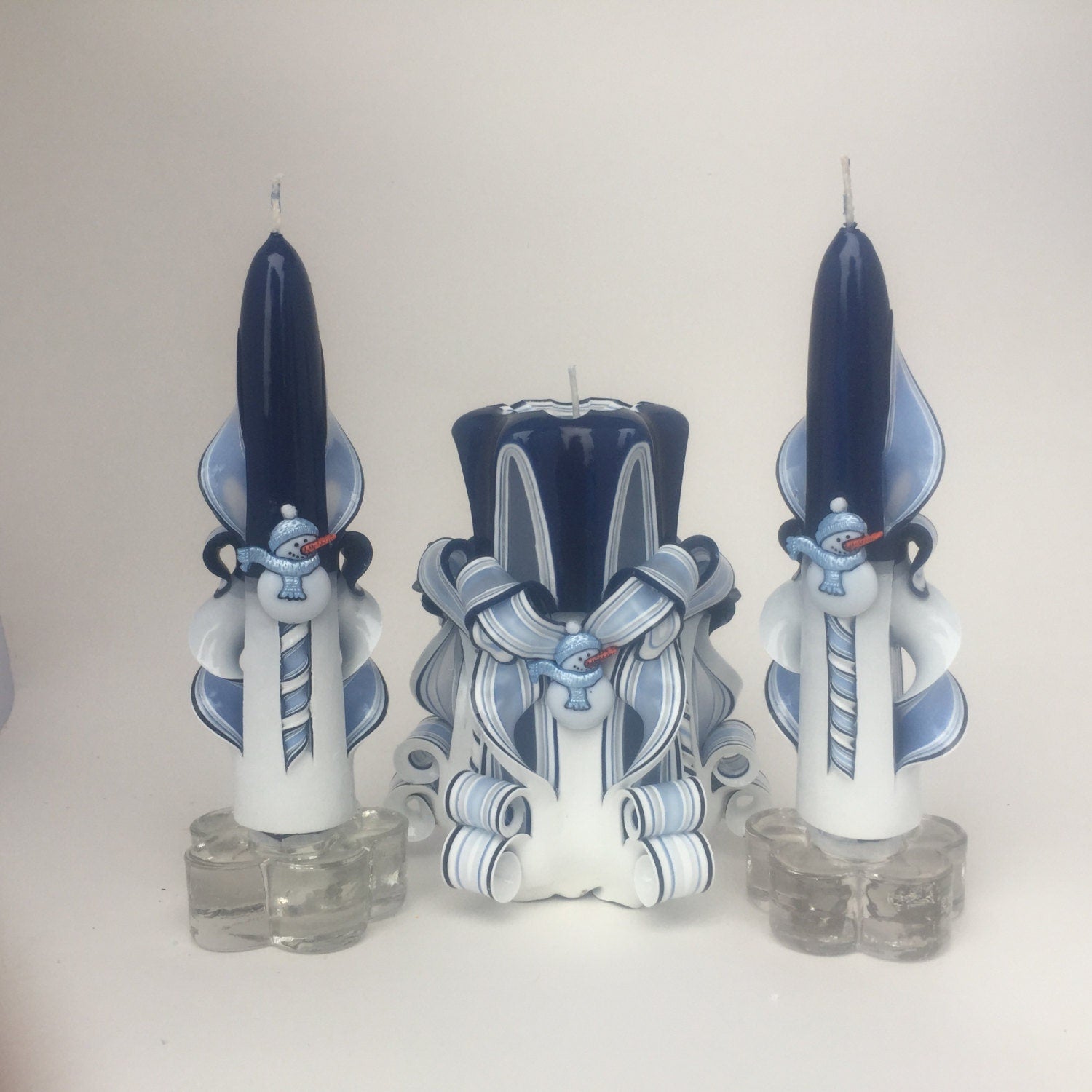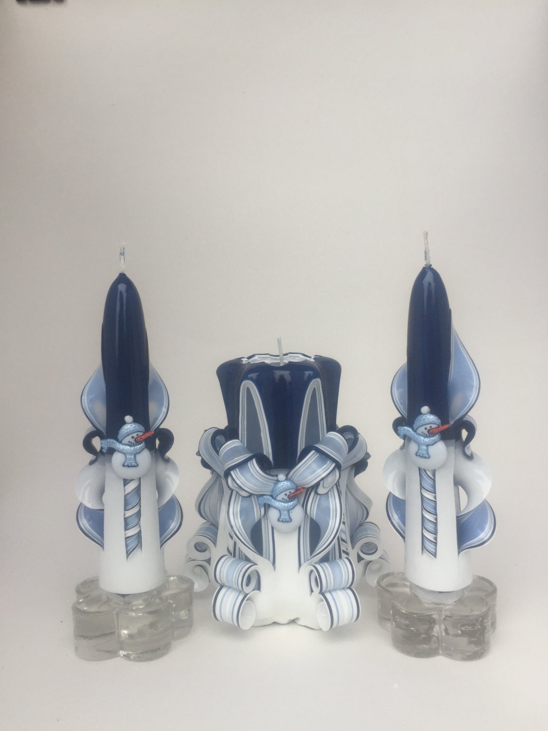 This cheerful snowman candle set can brighten your decor not only during Christmas, but all the way through the cold winter months! The pillar has three snowmen worked into the wax around the candle; the tapers each have a snowman on the front and twists up the back.