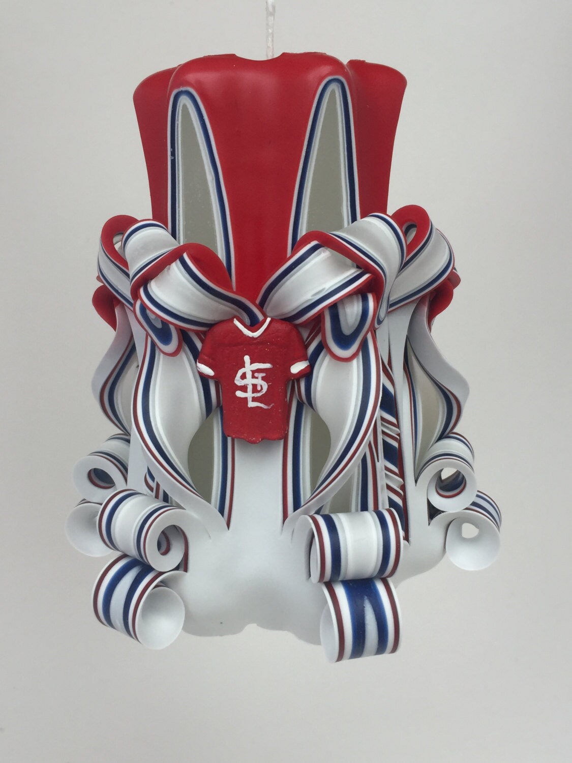 This hand-carved pillar candle is made in the St. Louis Cardinals' team colors. It has a white center, a dark blue stripe, and a red and white exterior. It is embellished with a red baseball jersey, a red Cardinals' baseball cap and a bat/ball combination.