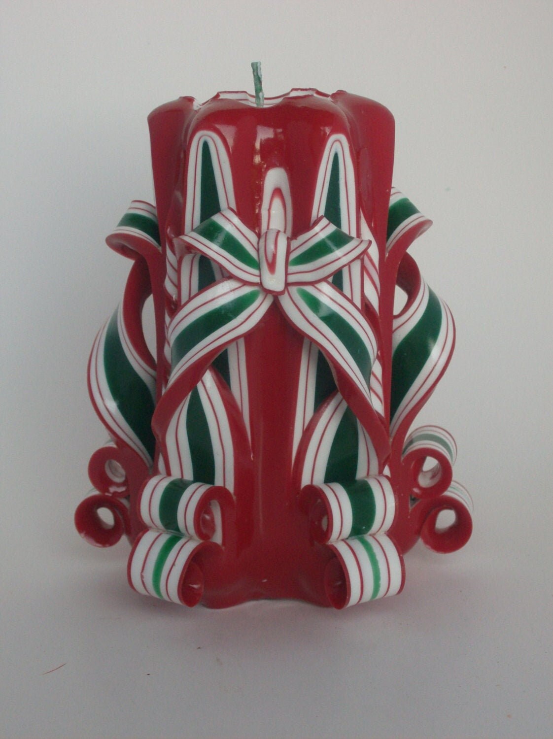 This carved Christmas pillar candle comes in a choice of three color combinations: