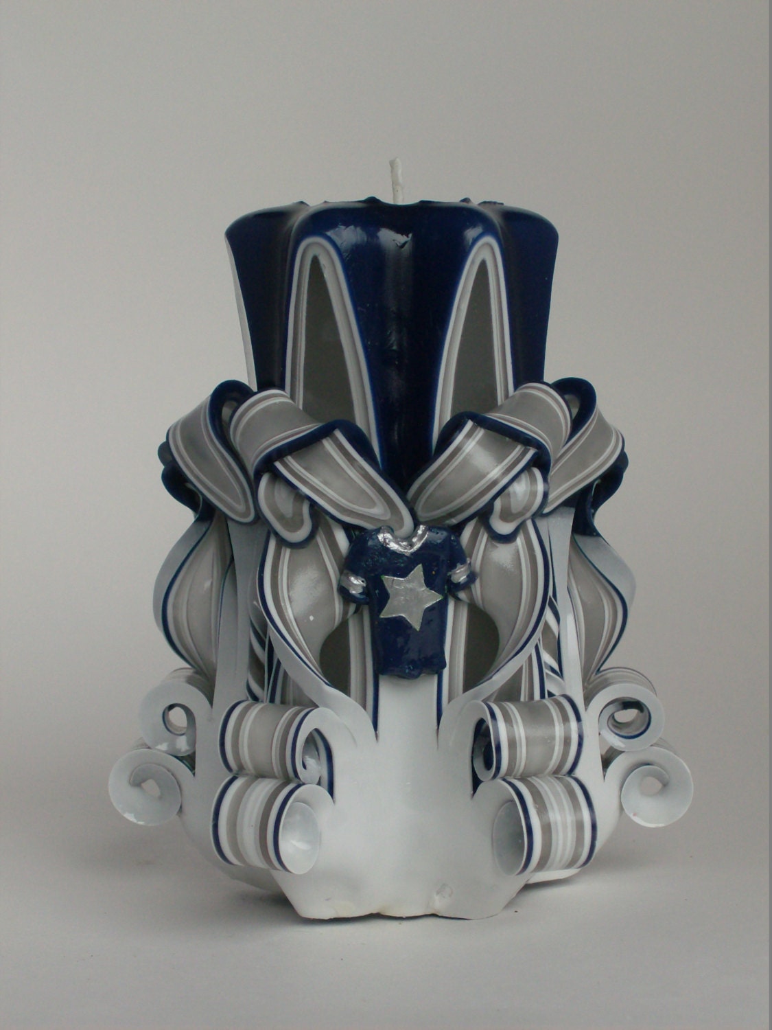 Hand-dipped and hand-carved, this candle has a silvery-gray center with a dark blue and white exterior. It features 3 themed embellishments worked into the wax around the sides of the candle.