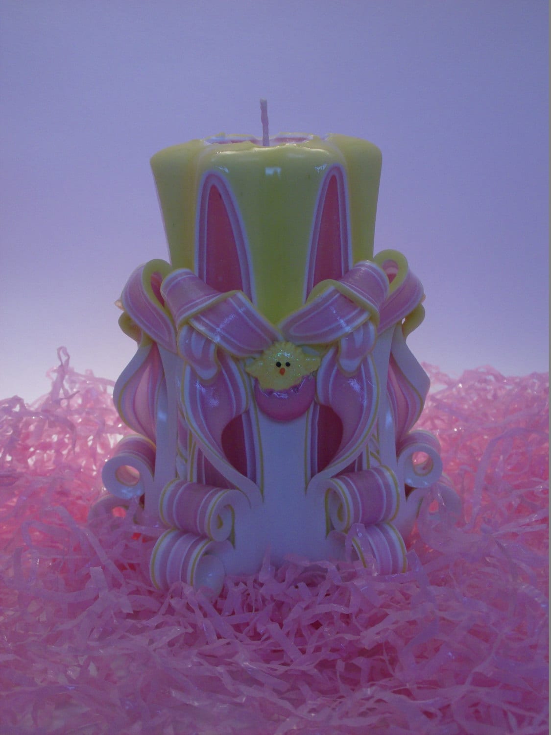 This hand-carved pillar candle has a hatching chick popping out of its shell, worked into the wax at three points around the candle.