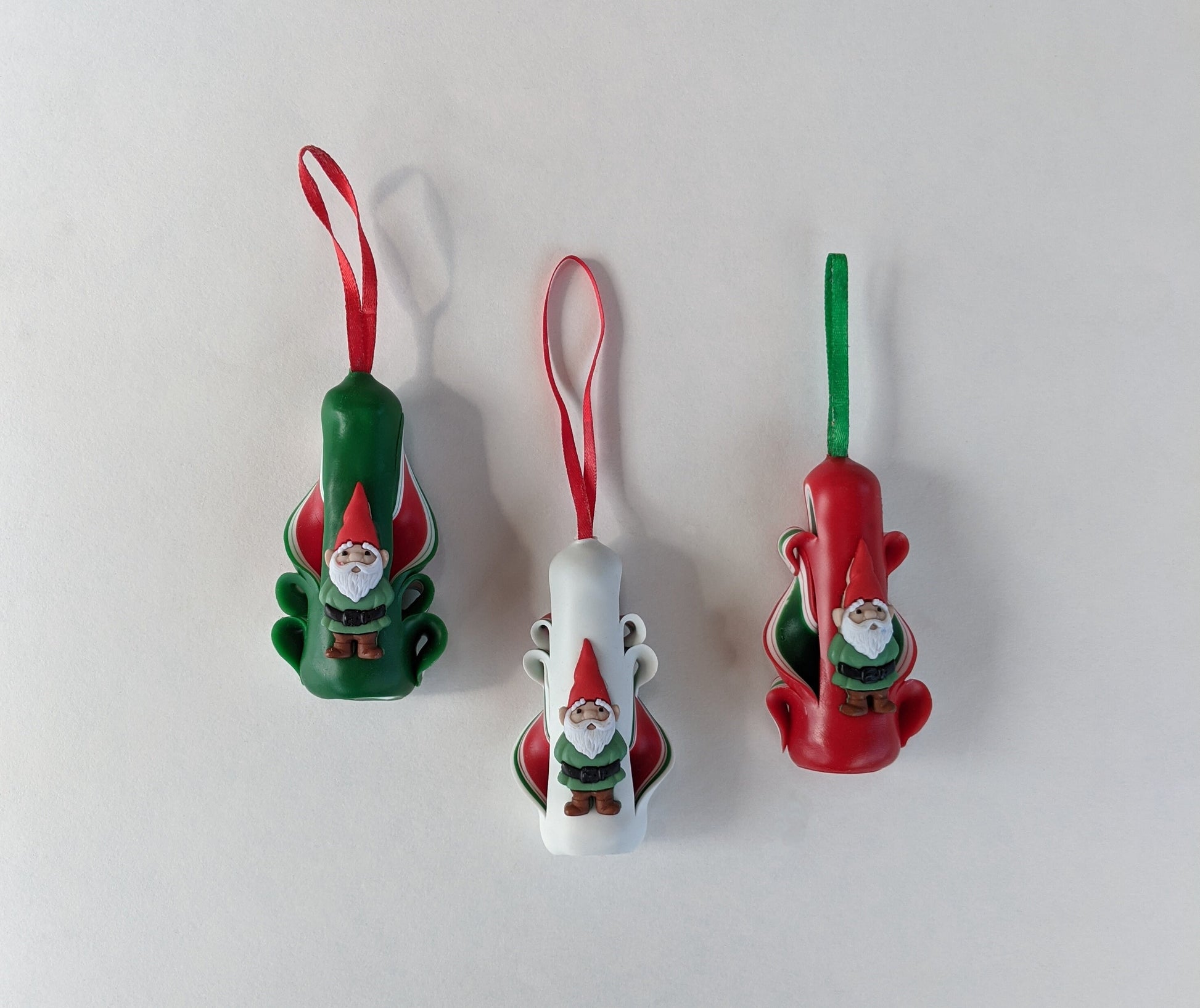 These three hand-carved wax ornaments are made in combinations of red, white, and green. Each is embellished with a cute gnome accent on the front. All are finished in a high-gloss candle glaze.