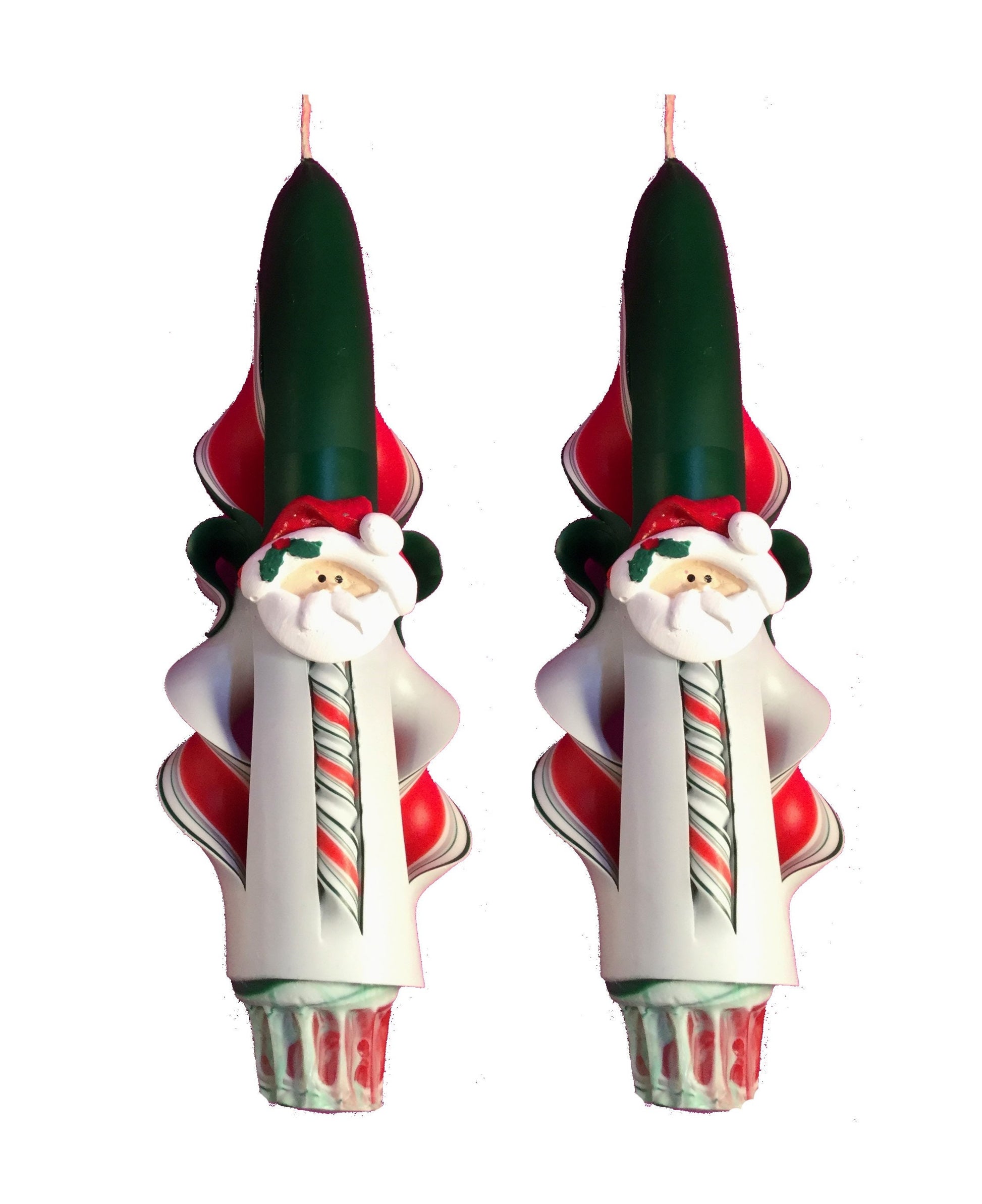This hand-carved candle set will make an fun Christmas centerpiece! The candles have a red center and a deep green and white exterior. The pillar has three Santa embellishments embedded in the wax at three equally spaced points around the candle. The tapers each have a Santa on the center front of each candle.