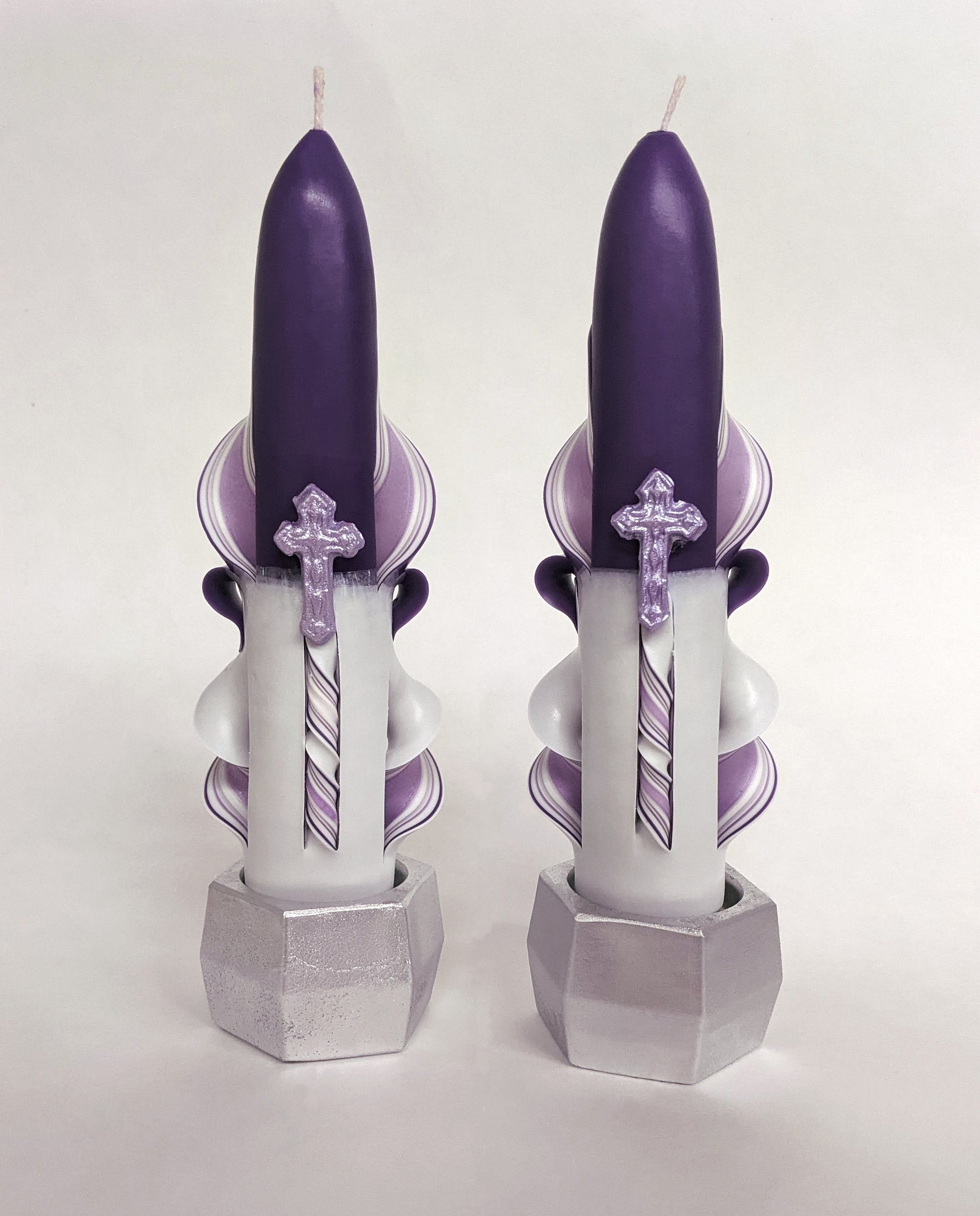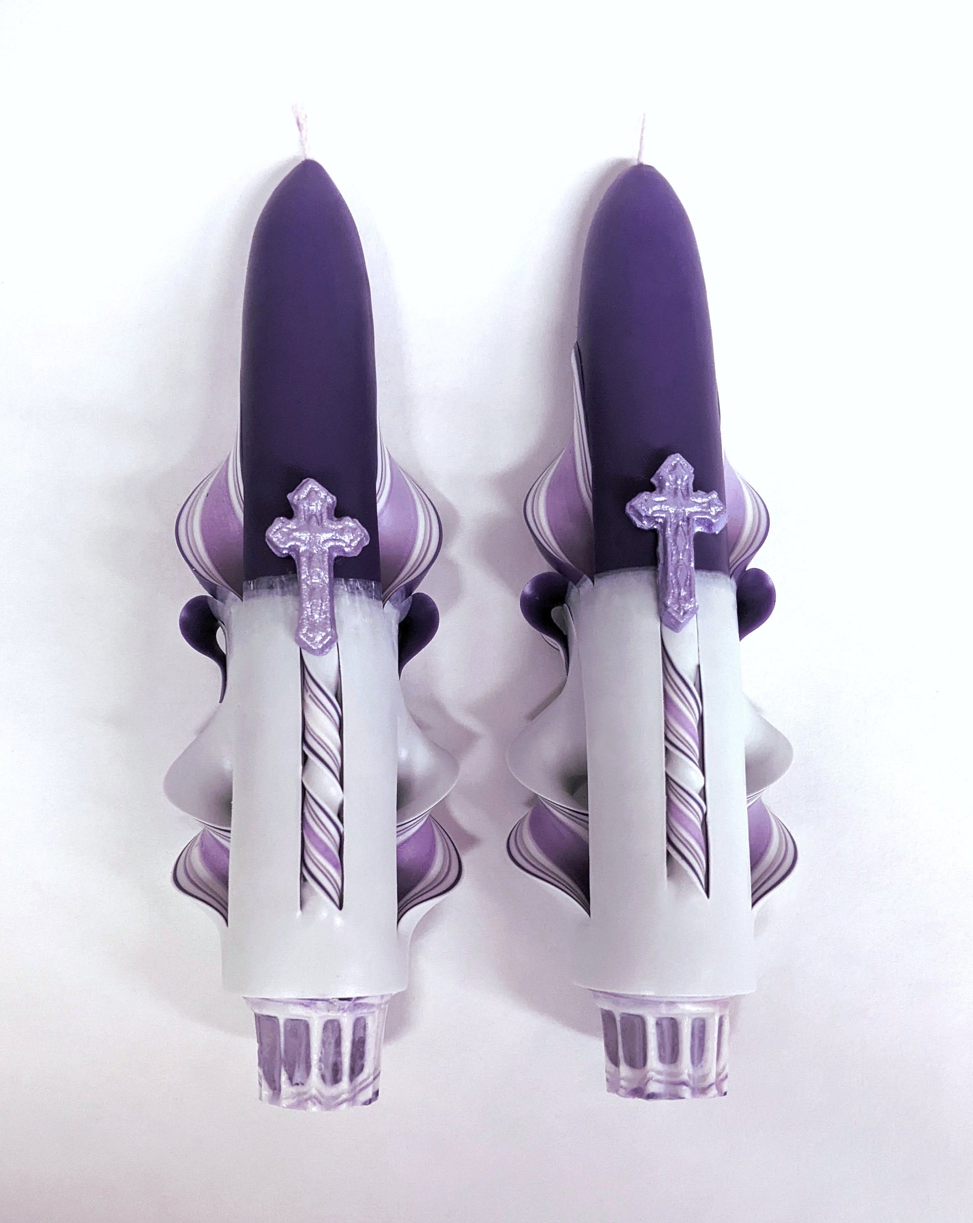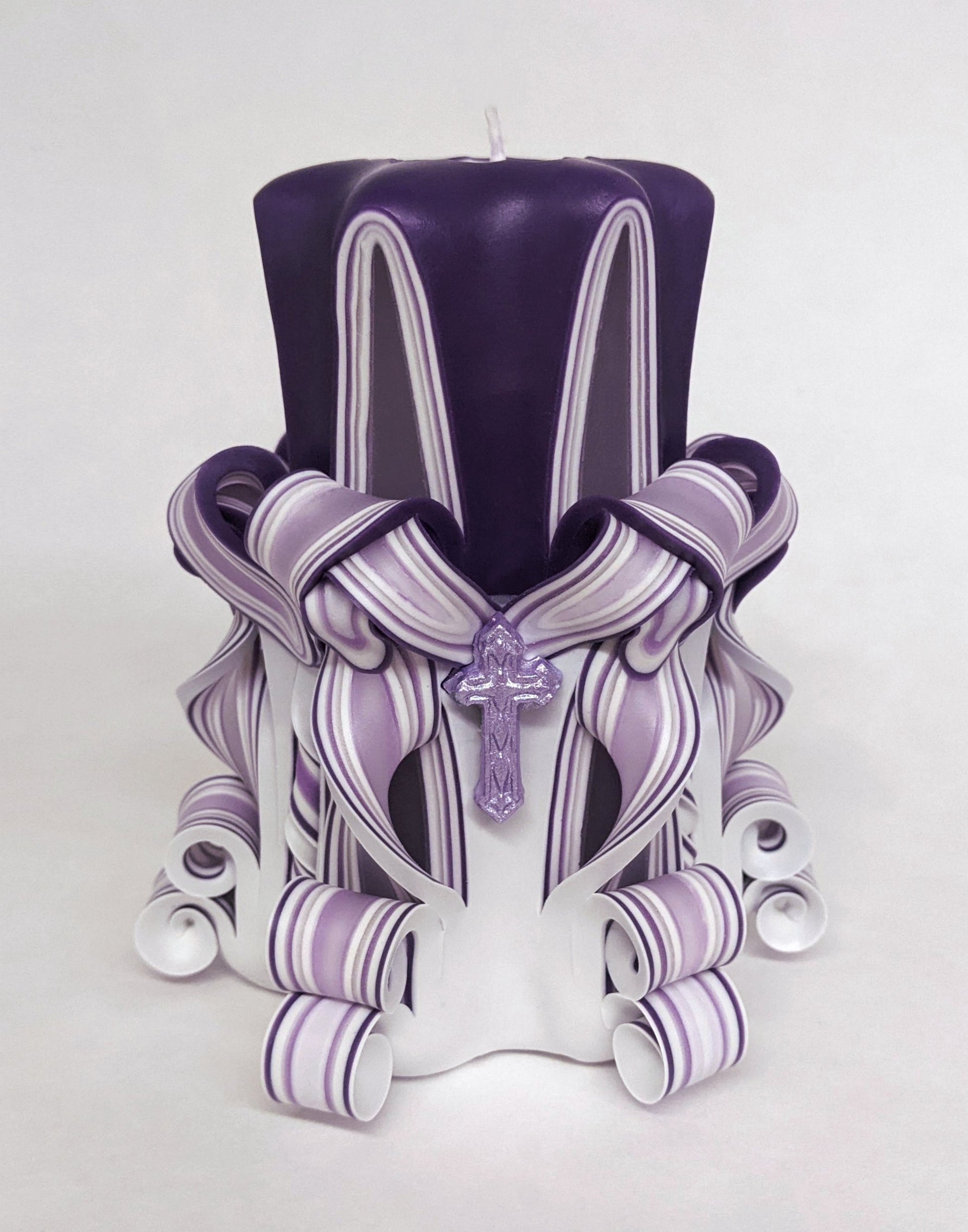 These hand-carved candles are made in varying shades of purple and white. The pillar features 3 handmade cross accents around the sides, while the tapers each have a cross at center front.