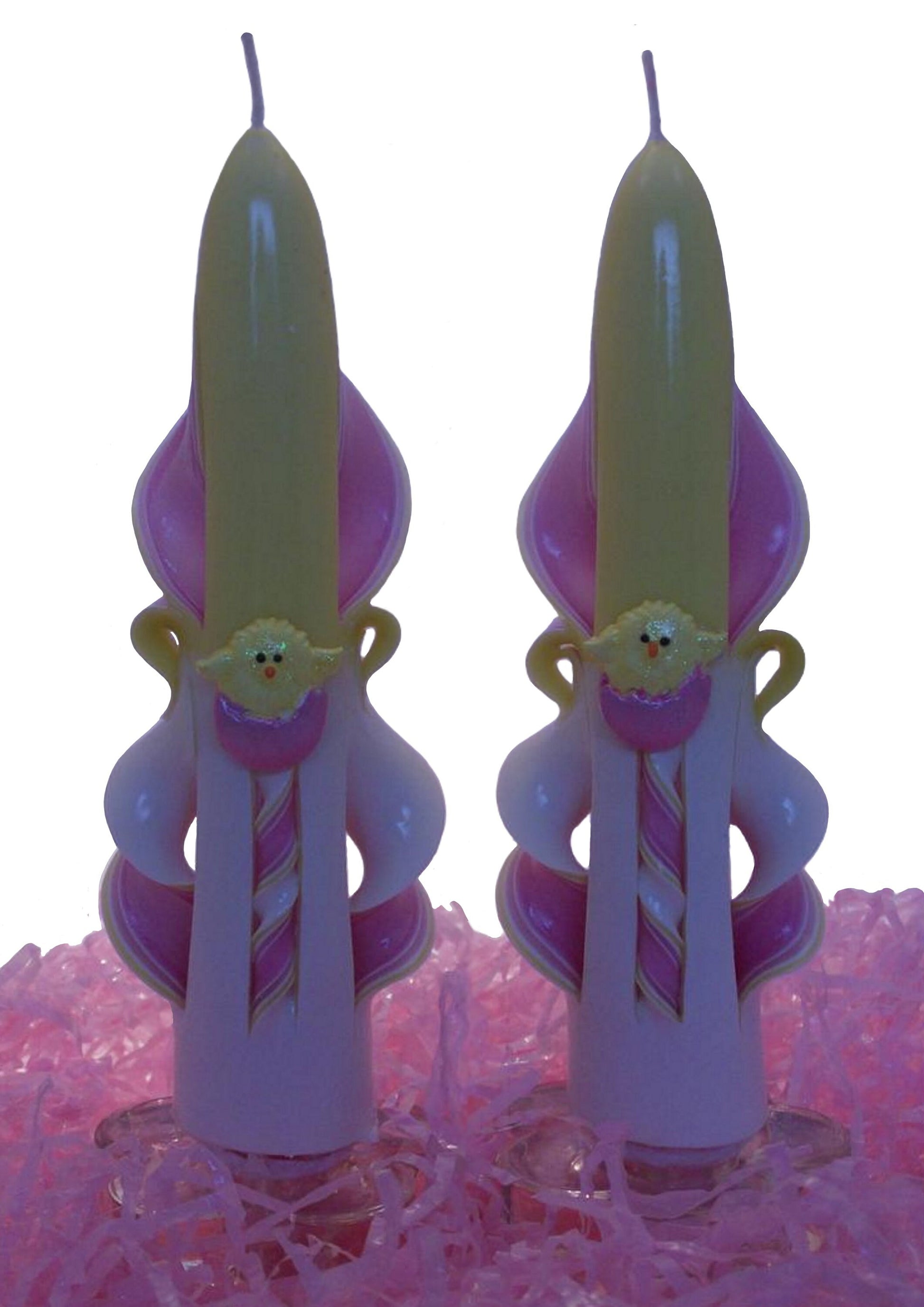 These hand-carved taper candles have a perky Easter chick popping out of its shell on the front of each candle. The shells are hand-painted in colors to match the candles.