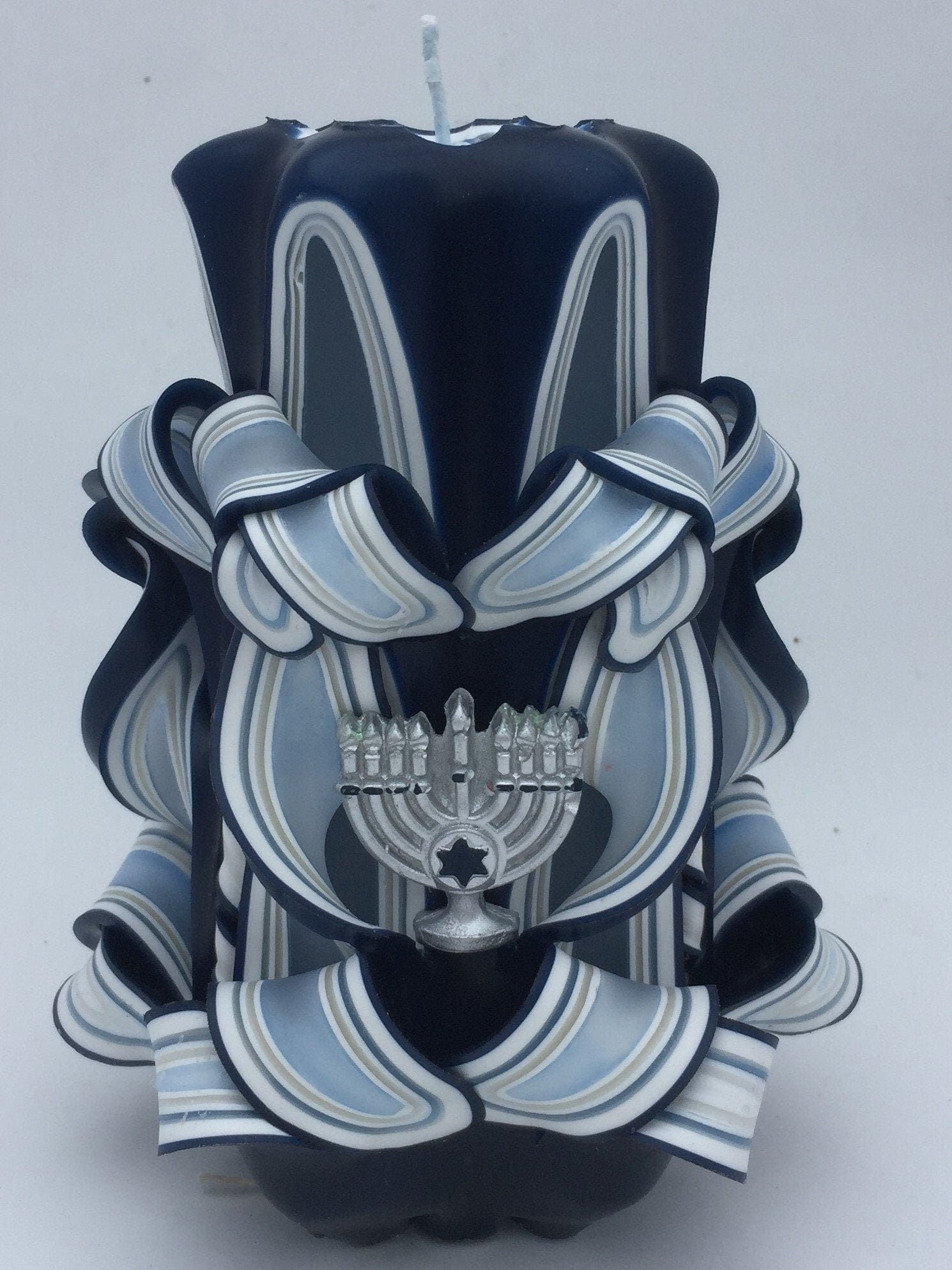 This hand-carved pillar candle is made with a light blue center, a silver accent stripe and a cobalt blue exterior. It has three silver menorahs worked into the wax at midpoint, equally spaced around the pillar.