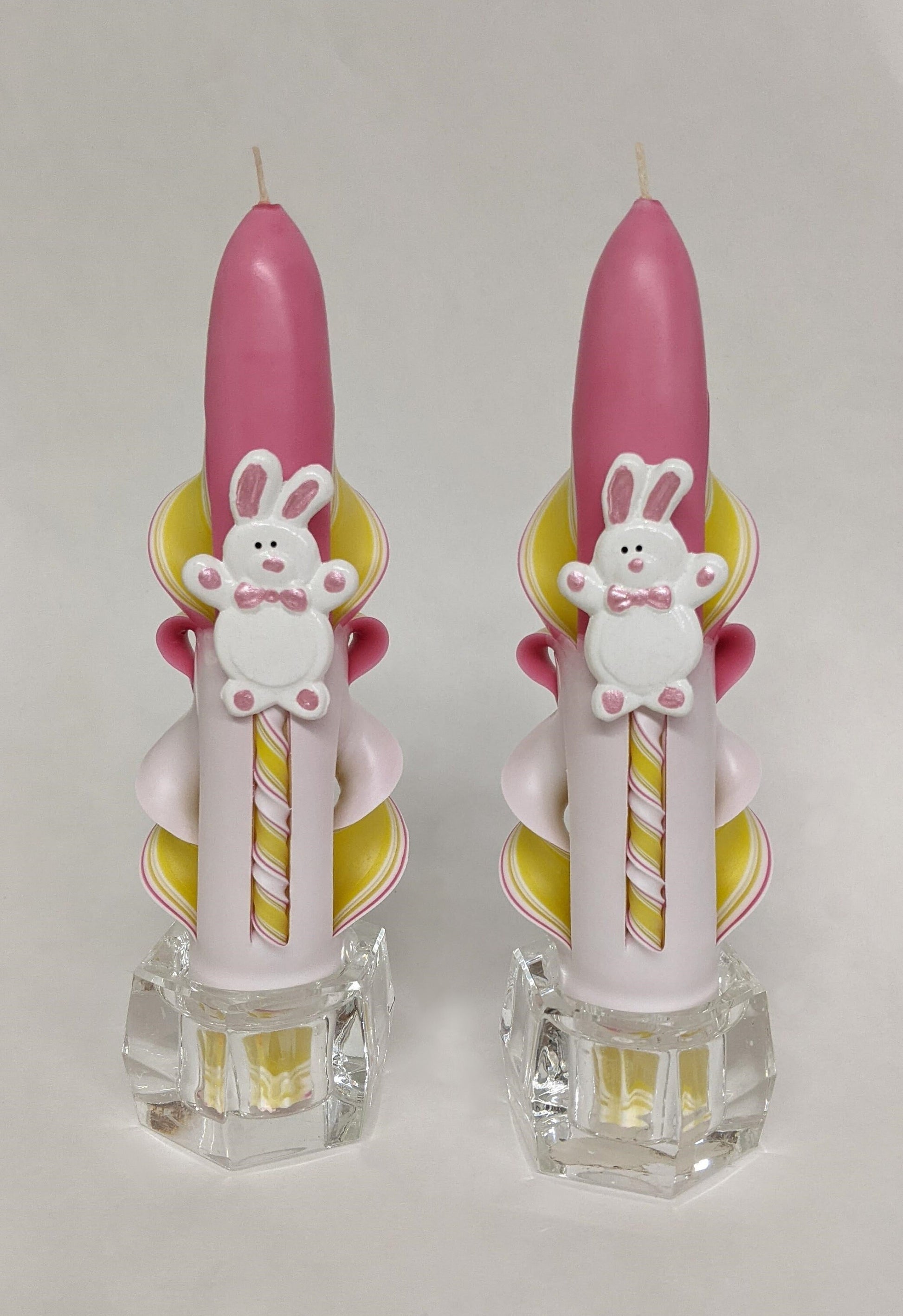 Hand-Carved Pink and Yellow Bunny Taper Candles - 6 Inch