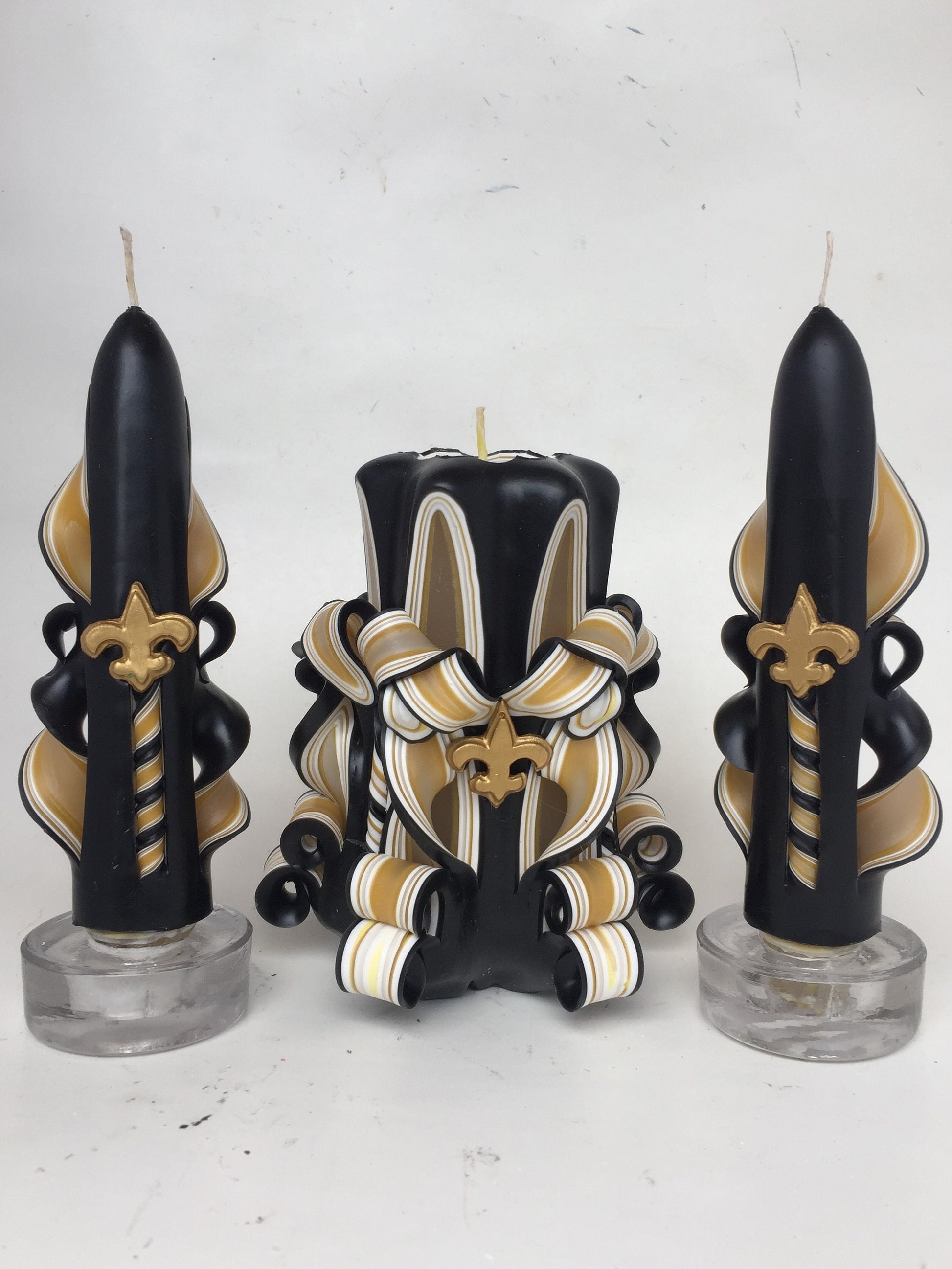 For the New Orleans Saints fan! This hand-carved pillar candle has a gold colored center and black exterior. It has three embellishments worked into the wax at midpoint, equally spaced around the candle: a fleur-de-lis, a gold and black football, and a gold and black jersey.