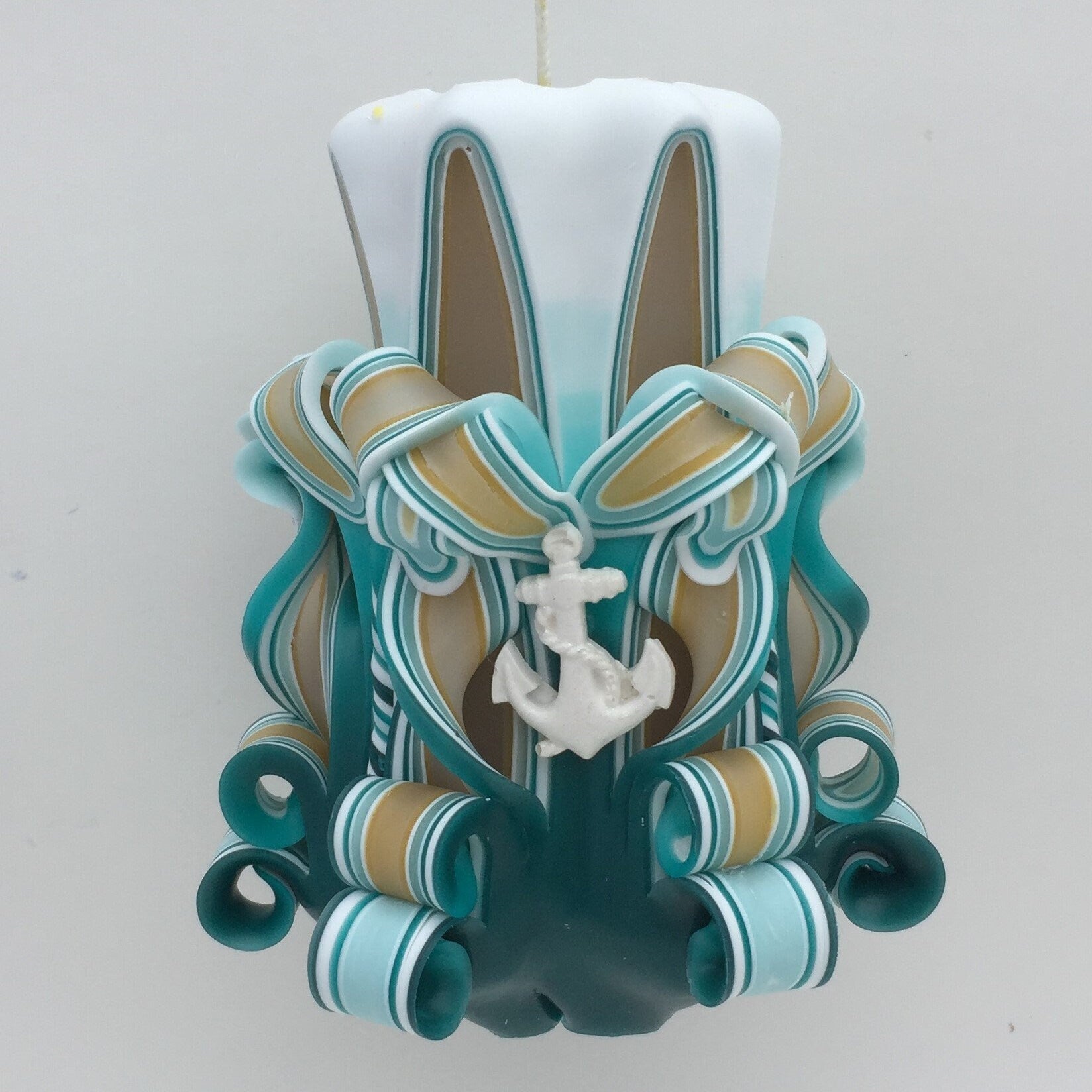These hand-carved candles are made in ocean colors with a sand colored center followed by shades of teal/aqua and white. Feel free to choose your own accent pieces (see available options in the last picture) - there is room for 3 accents around the sides of the pillar, and 1 accent on each taper. If no choice is made, the pillar will be made with a sailboat, an anchor and a lighthouse, and the tapers will each feature a starfish.