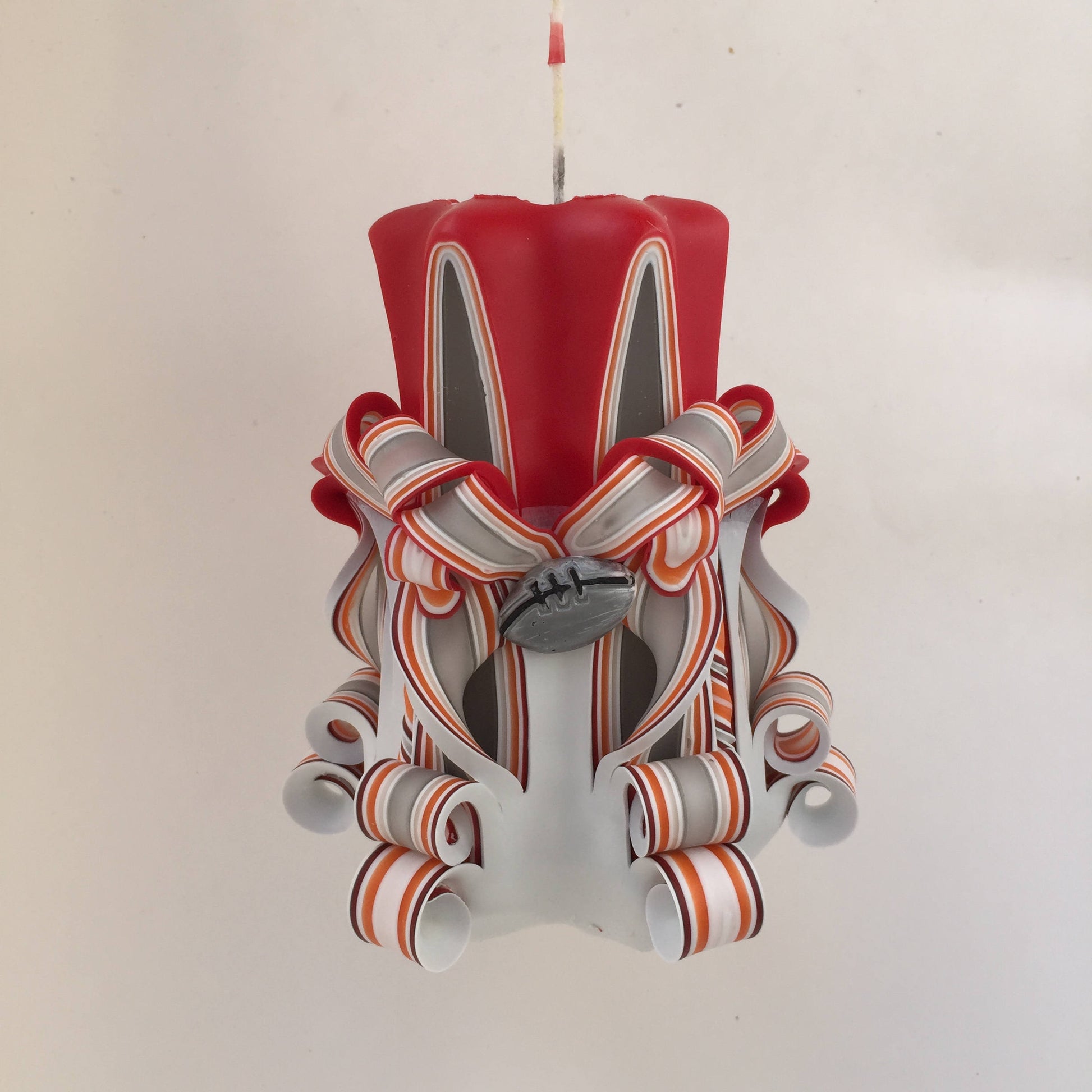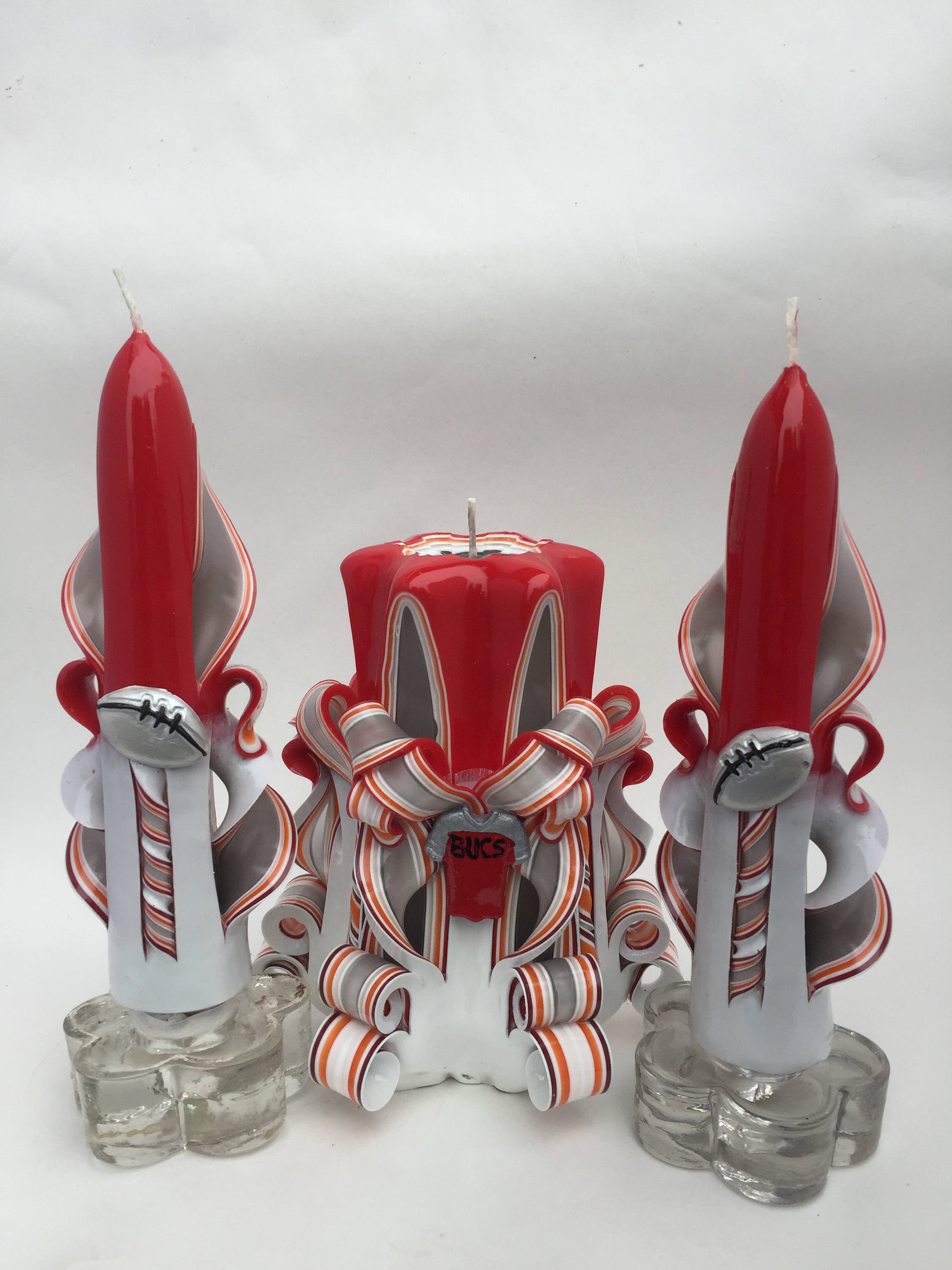Choose either a pillar candle or a three piece centerpiece set made in colors of Tampa Bay Buccaneers: pewter colored center, orange accent stripe, and a red and white exterior. The pillar candle has three accents: a "Bucs" jersey, a Tampa Bay Banner, and a silver football. The taper candles each have a silver football center front.