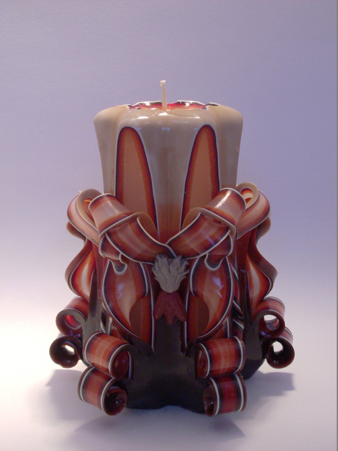 This hand-carved pillar candle is made with rich earth tone layers. Choose between a brown toned exterior with no embellishments, or with corn stalks or pumpkins, or a cream exterior with a whimsical pilgrim turkey. The embellishments are worked into the wax at mid-point, equally spaced around candle in three places.