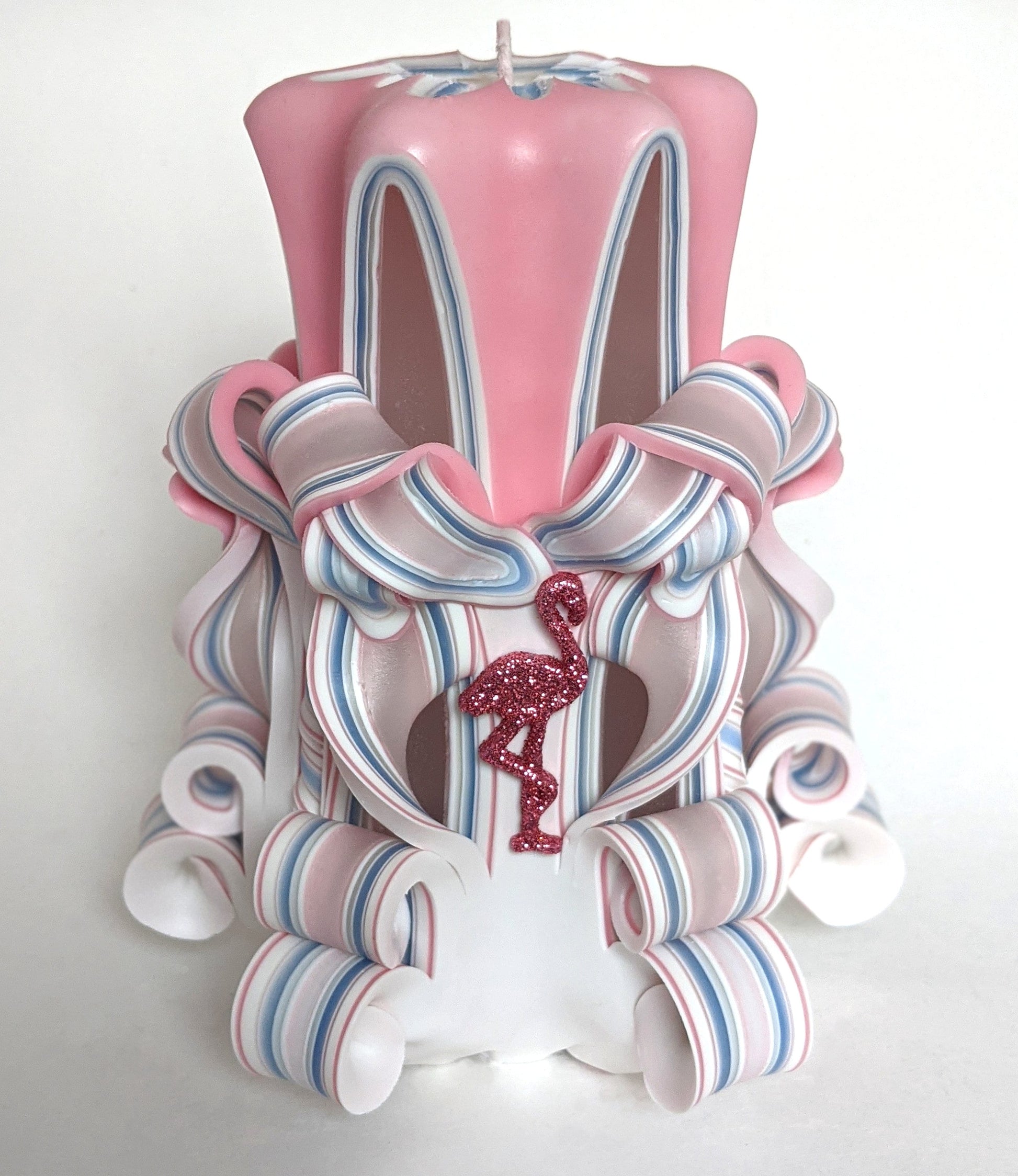 For the fun crowd! This 5 inch tall candle is hand-dipped and hand-carved, using layers of pink and white wax, or with a stripe of blue added in. It has three glittering pink flamingos worked into the wax at equally spaced points around the candle. It is finished with a high-gloss candle glaze.