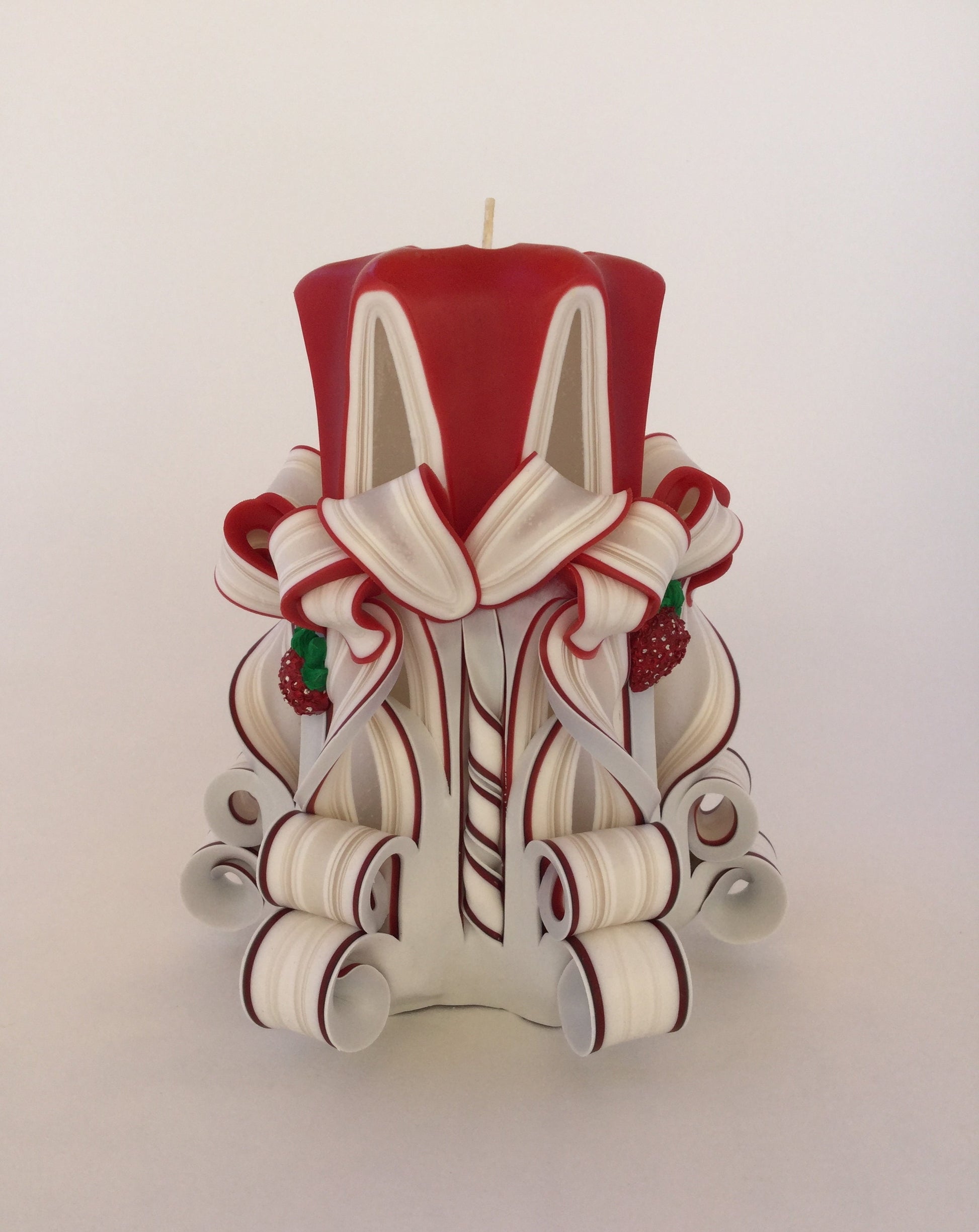 This hand-carved pillar candle is made in bright red and white, and accented with three handmade strawberry embellishments around the candle. It makes a great addition to your summer decor, or the perfect gift for the gardener in your life!