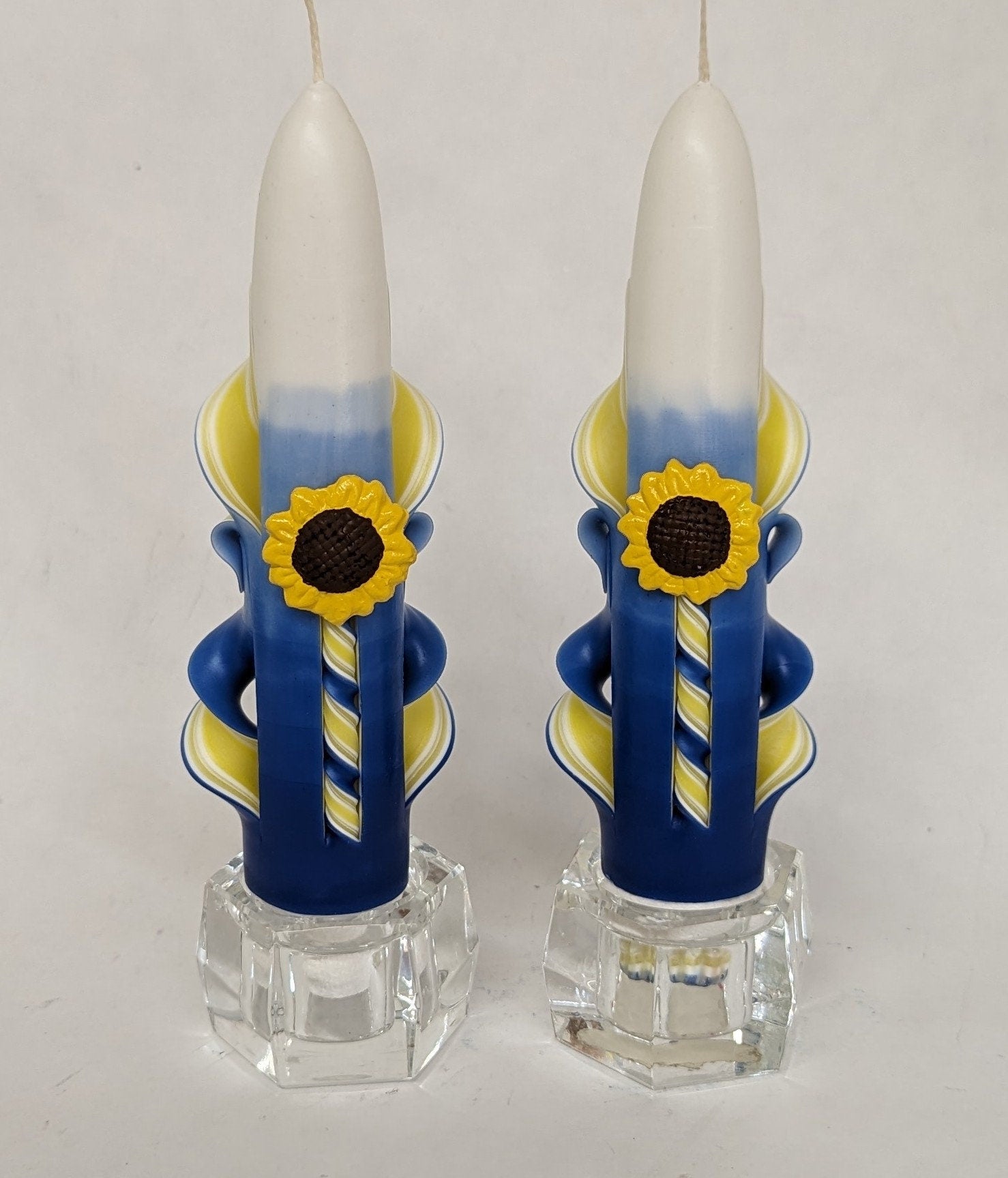 These two bright taper candles are made in shades of yellow, white and blue. They feature handmade sunflower accents on the front, and twists up the back.