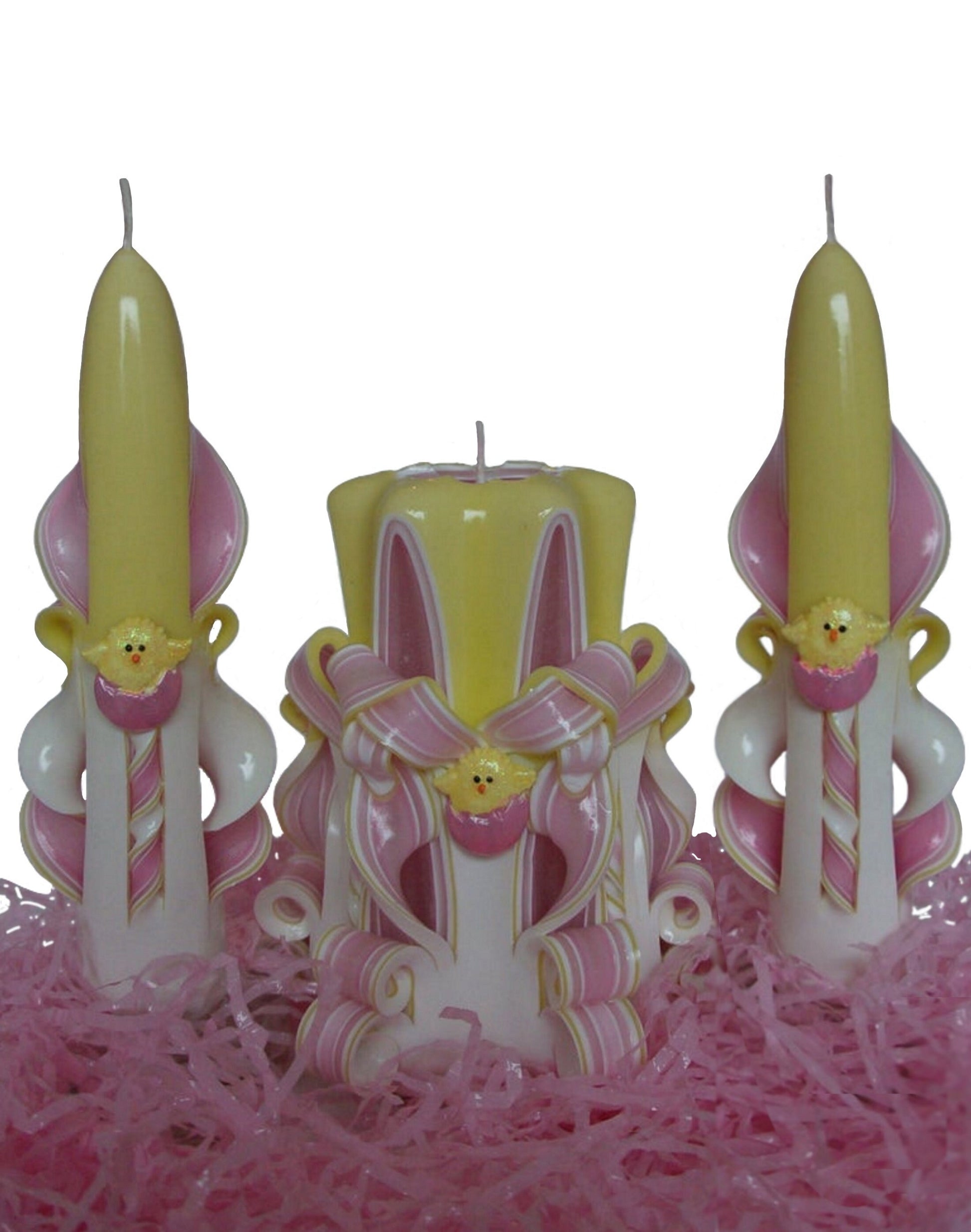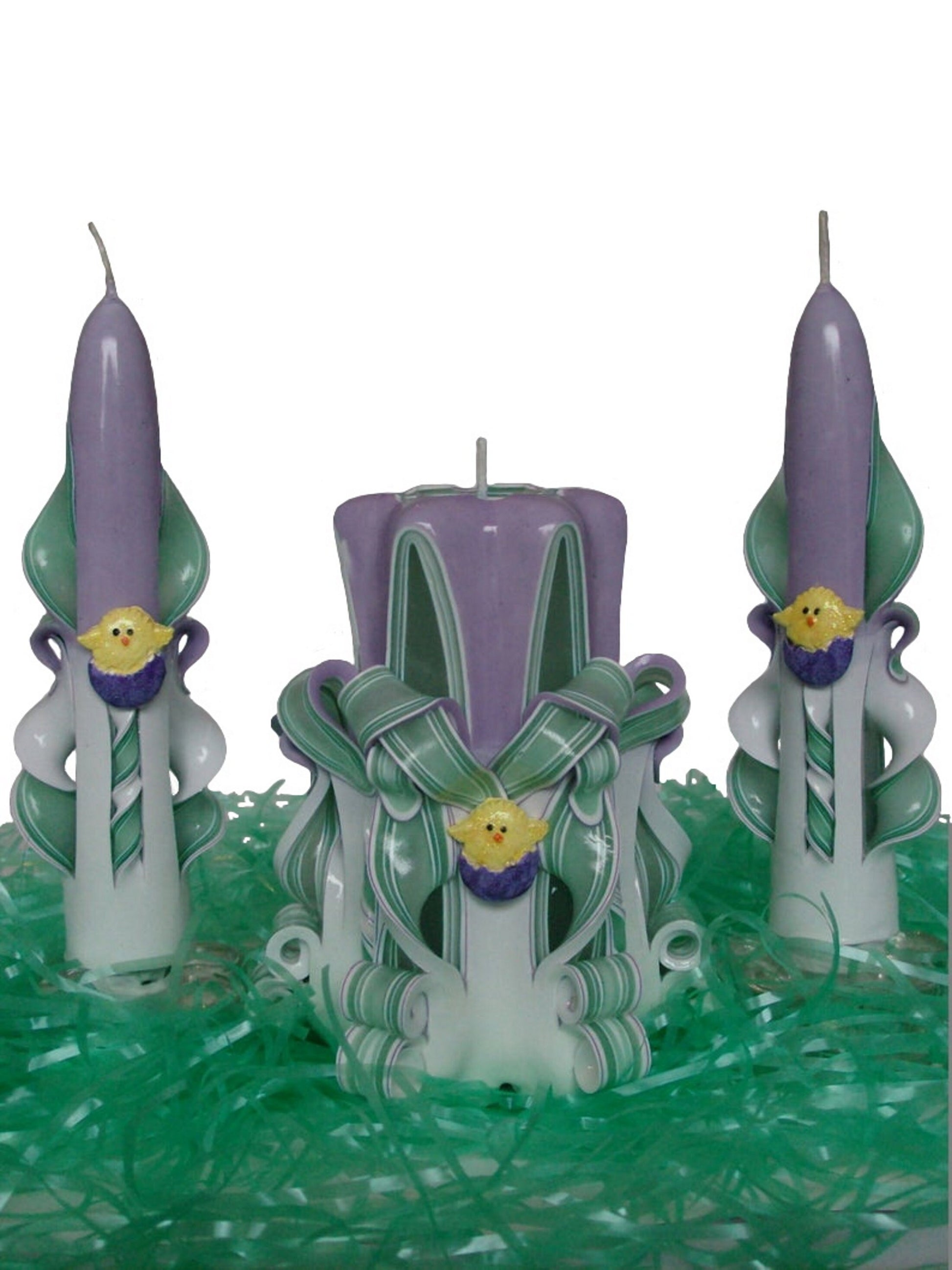 These hand-carved candles are made in fresh spring colors and each feature a perky Easter chick popping out of its shell. The pillar is 5 inches tall and has three chicks worked into the wax at three equally spaced points around the candle. The tapers are 6 inches tall, and will fit any standard candle holder (holders shown are not included); they have a chick on the center front of each taper. All are finished in a high-gloss candle glaze.