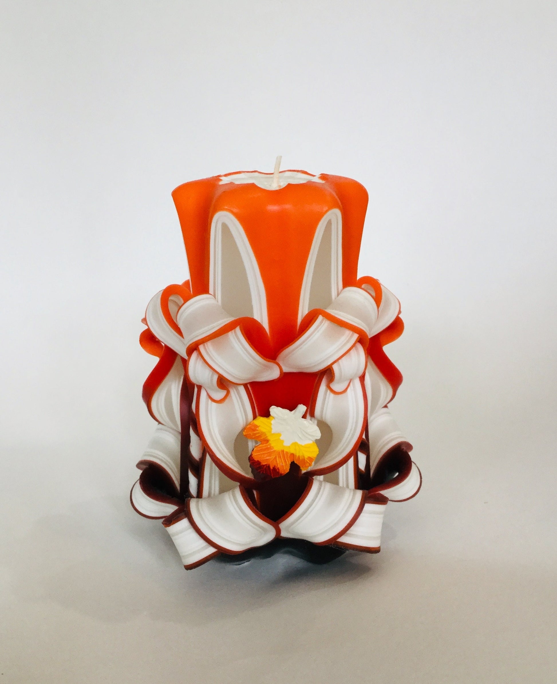 This hand-carved candle set makes a wonderful fall decoration! The candles are made in shades of rich orange, rust and dark brown. The pillar has three hand-painted leaf accents worked into the wax around the sides of the candle. The tapers each feature a leaf at center front.