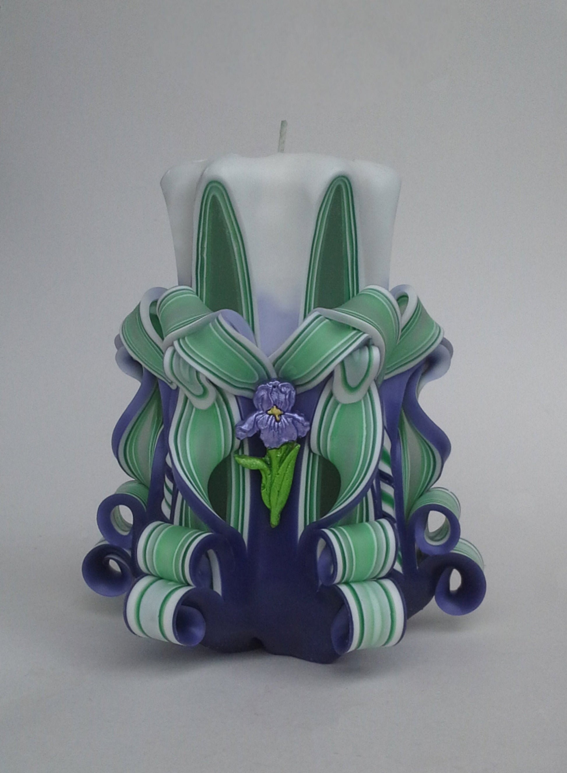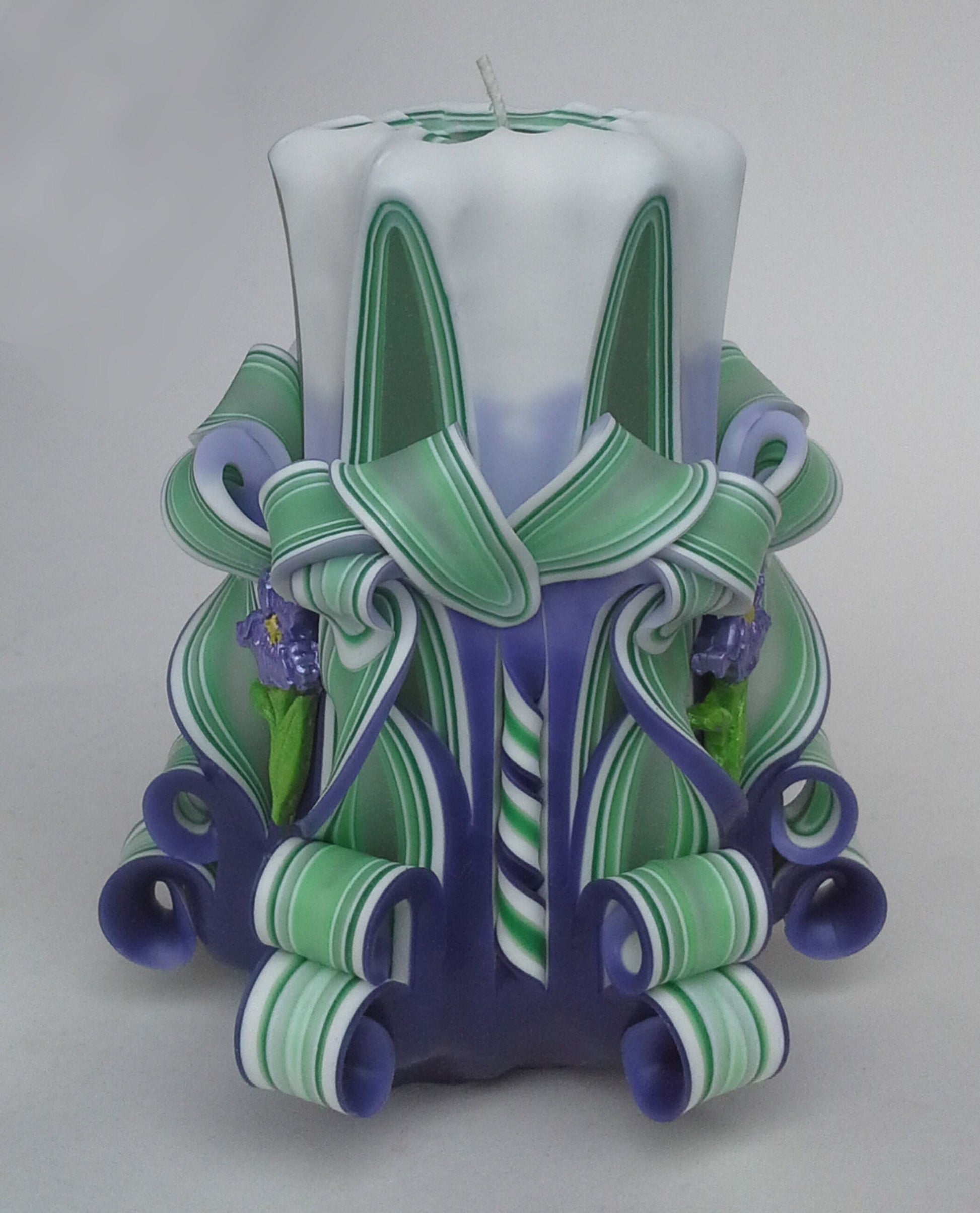Three spring irises adorn this hand-carved pillar candle. It is made with a light, mint green interior, followed by shades of violet and white, with the iris accents worked into the wax at equally spaced points around the candle.