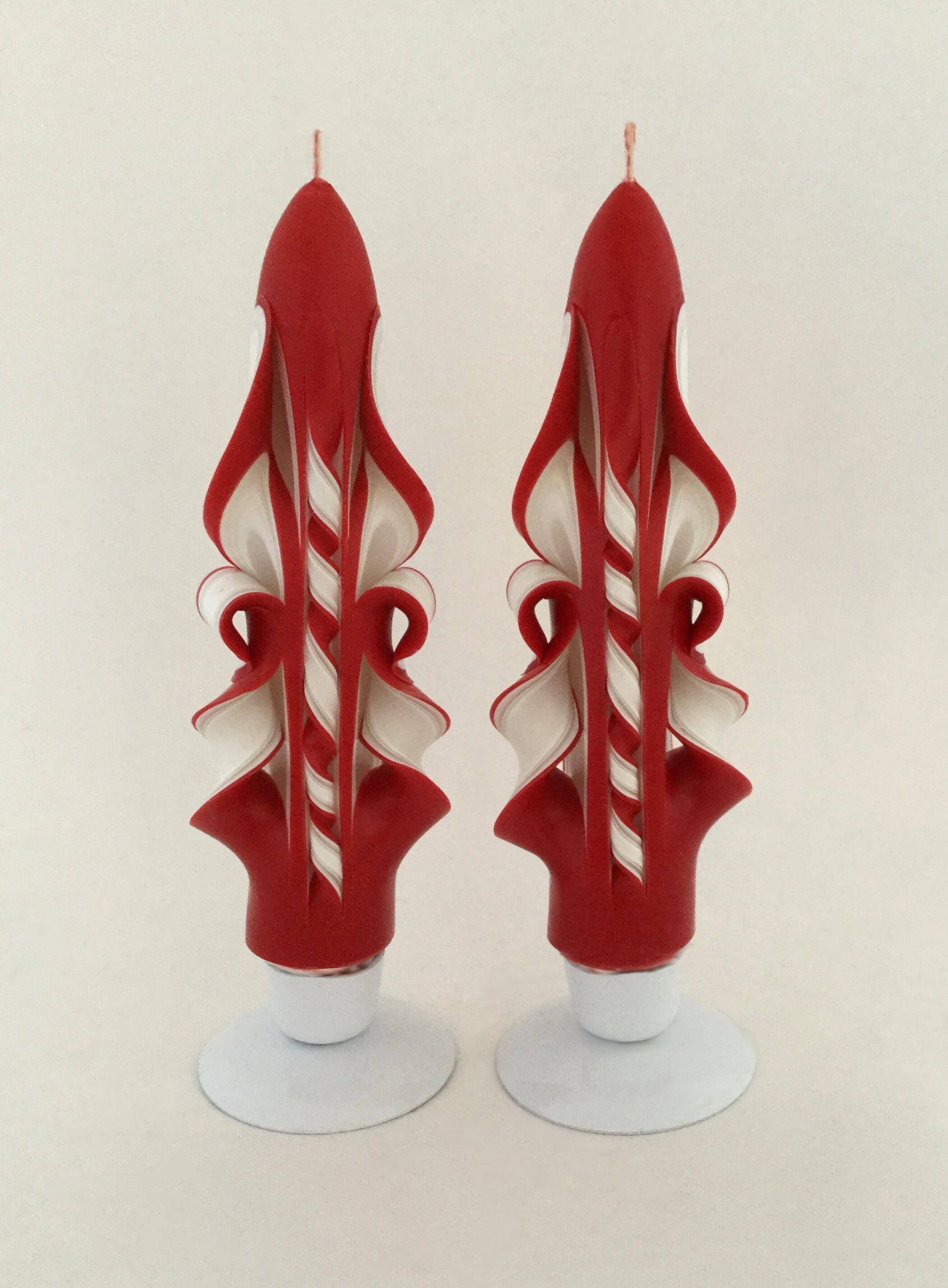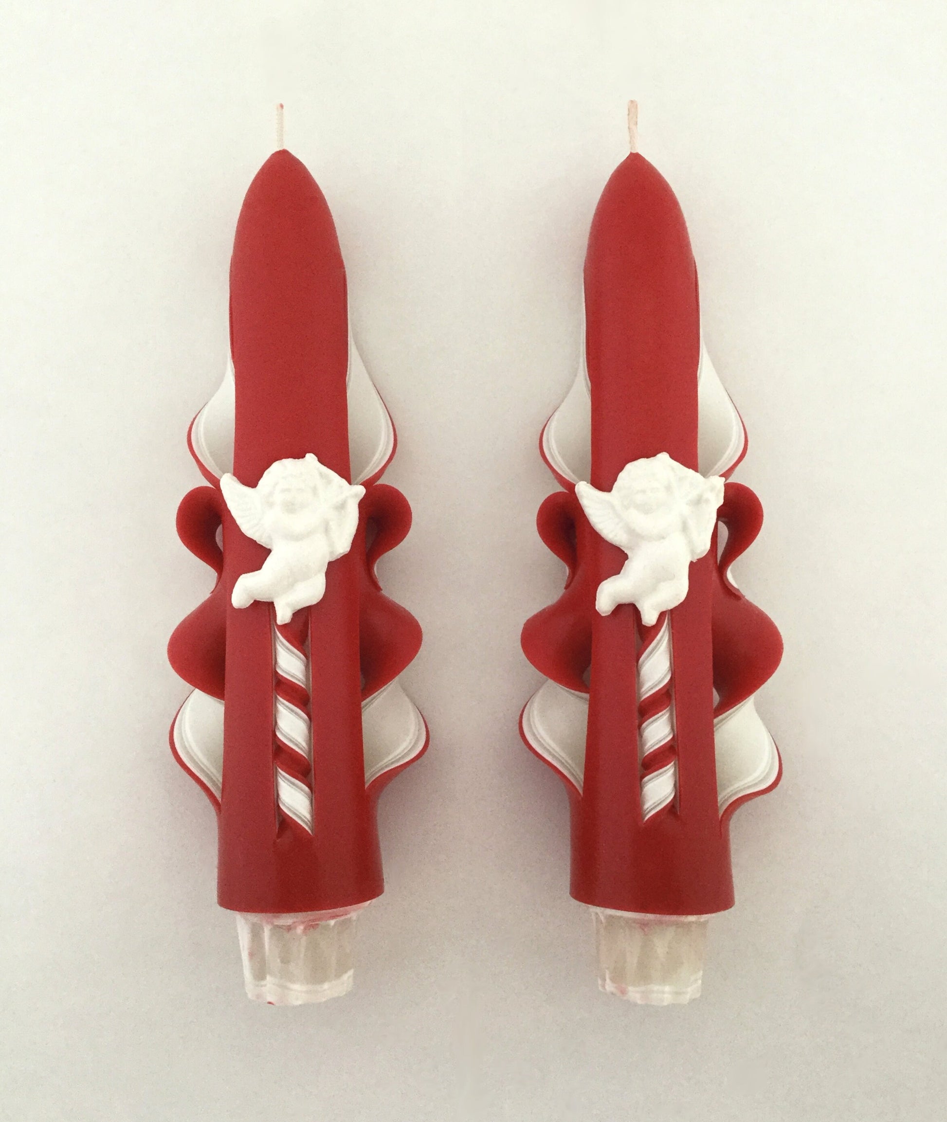 These taper candles come as a set of two and are hand-carved with care. Their interiors are made in layers of white and clear wax, while the exterior is a rich red. They feature handmade Cupid accents on the front and twists up the back.