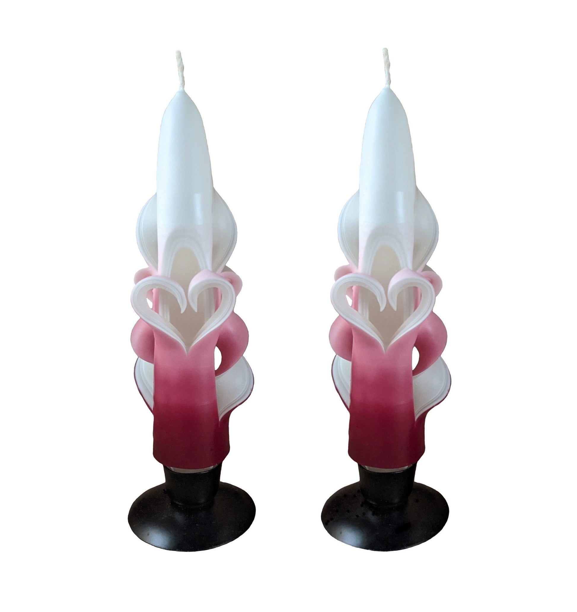 These romantic Valentine heart candles are made with layers of white and clear wax, with exteriors that are shaded from white to dark pink. They feature a hand-carved heart on the center front of each taper.