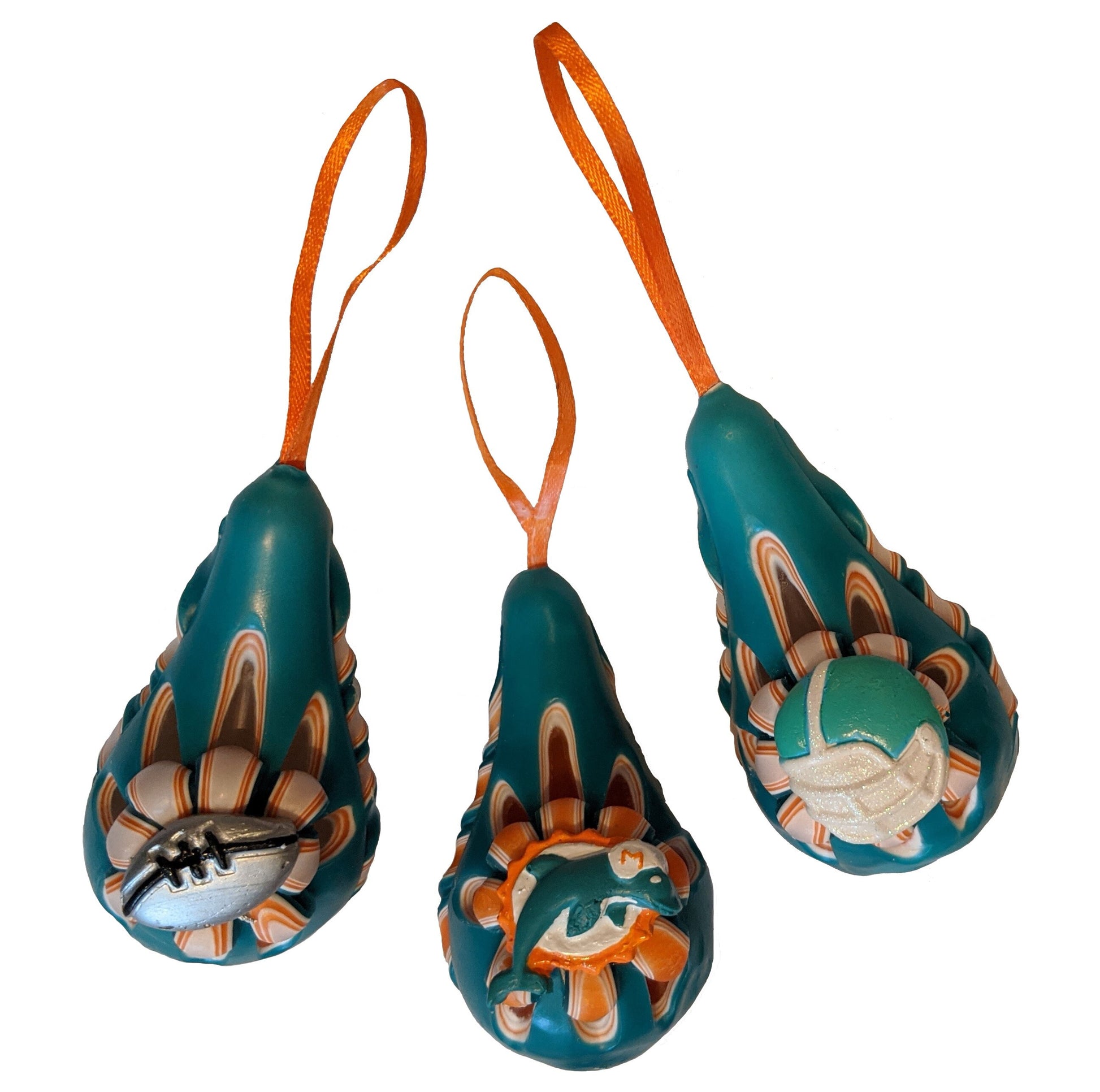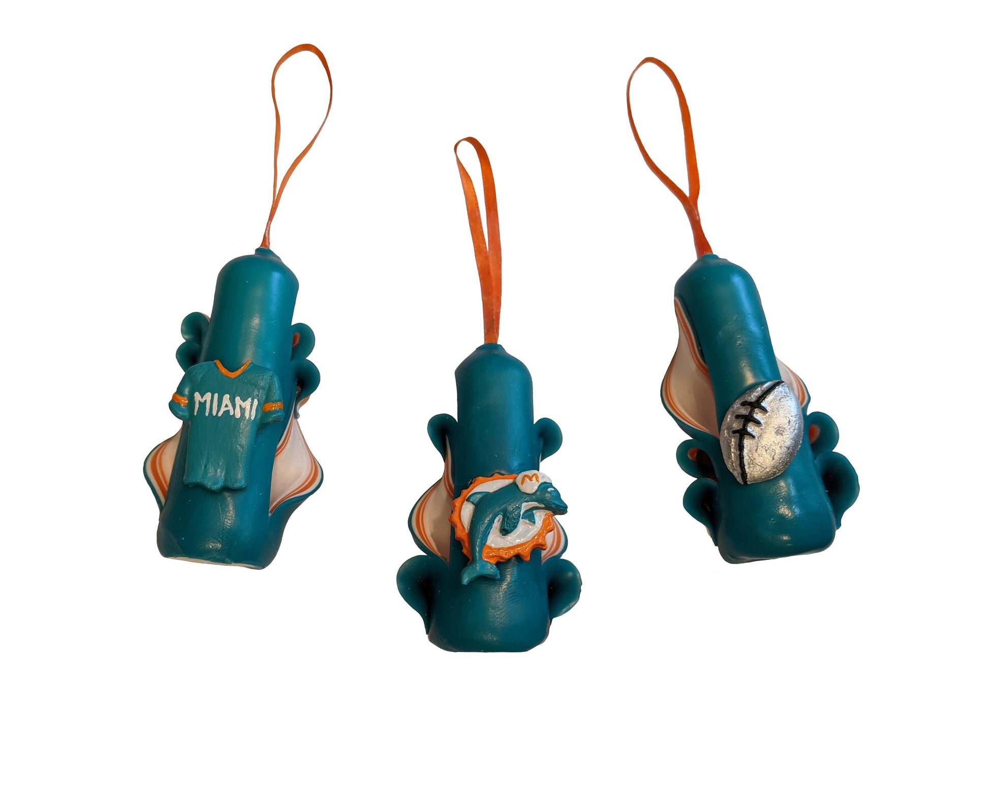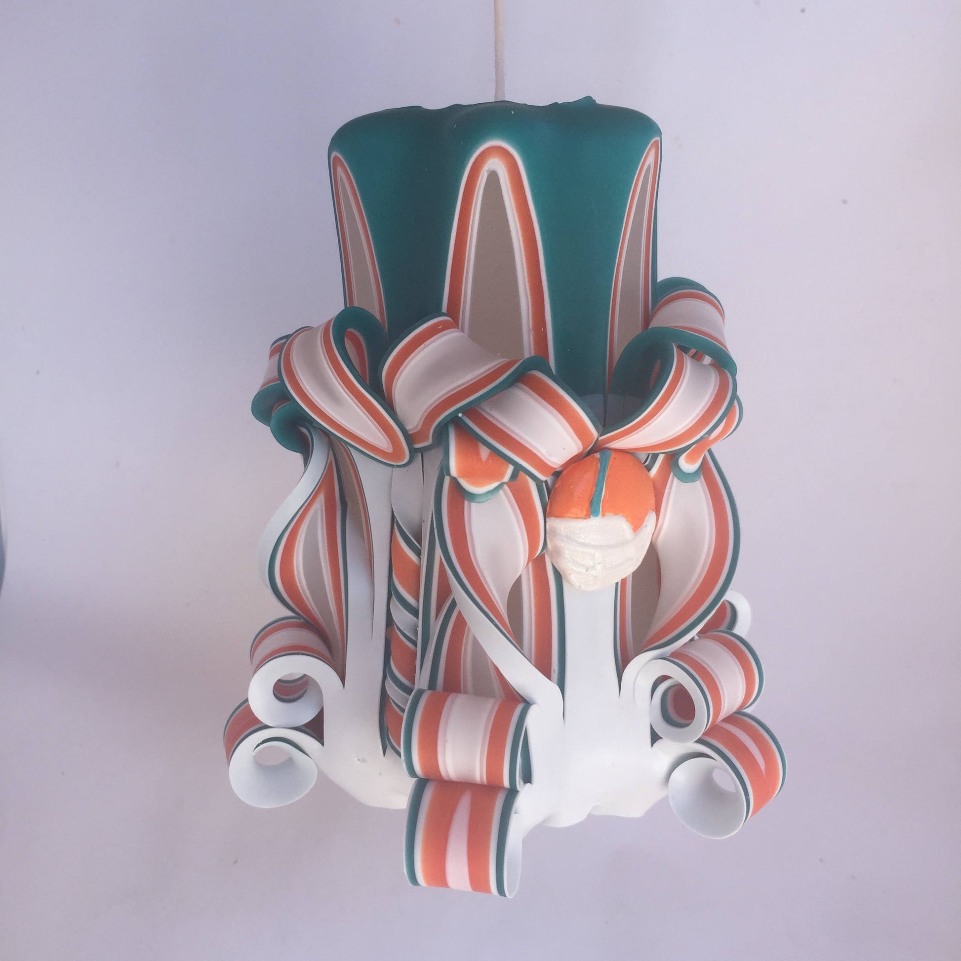 This hand-carved pillar candle is made with layers of white, orange and aqua colored wax. It is embellished with a dolphin, a jersey and a helmet, equally spaced around the candle. It stands about 5 inches tall and is finished with a high-gloss candle glaze.