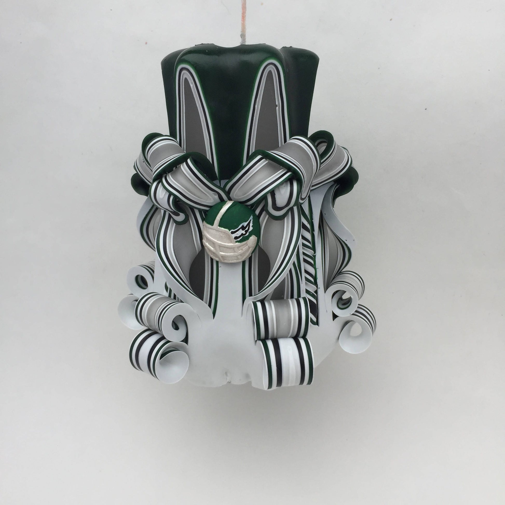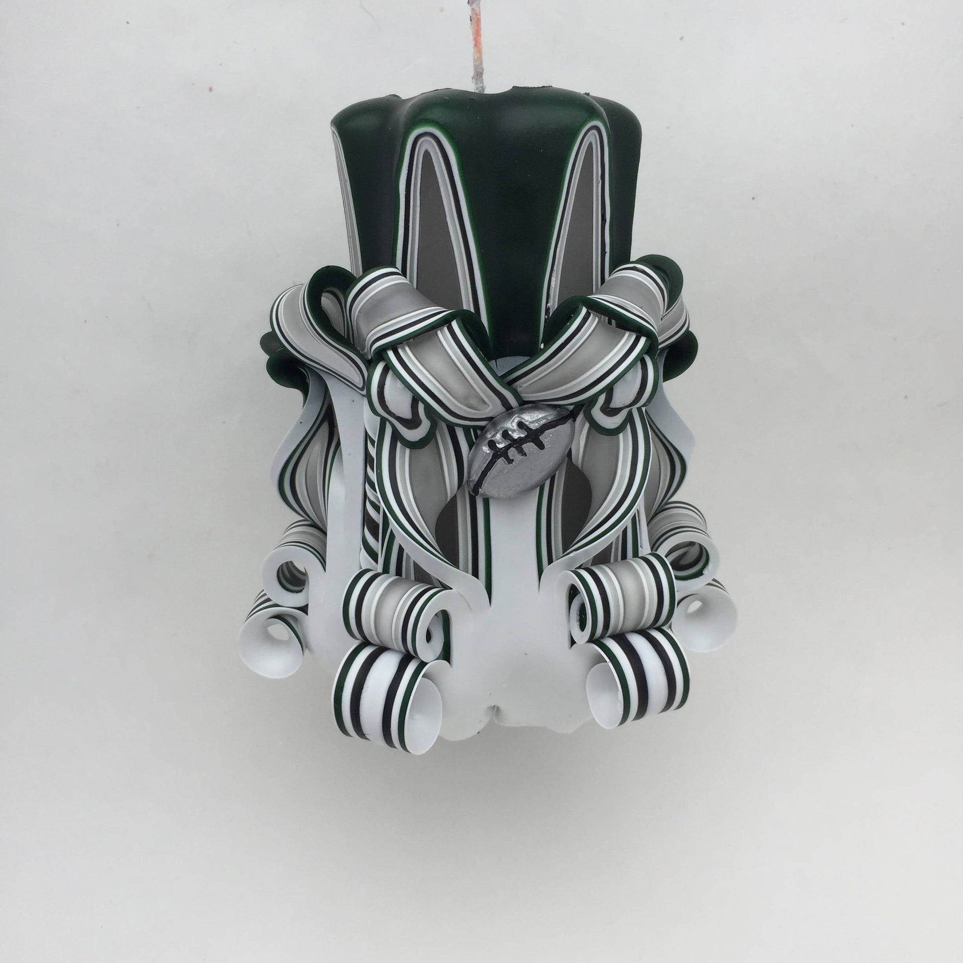 Show your spirit with this hand-carved candle made in the team colors of the Philadelphia Eagles football team! It has a silvery-gray center, a black accent stripe, and a deep green and white exterior. It has three accents equally spaced around the sides of the candle: a jersey, a helmet and a football.