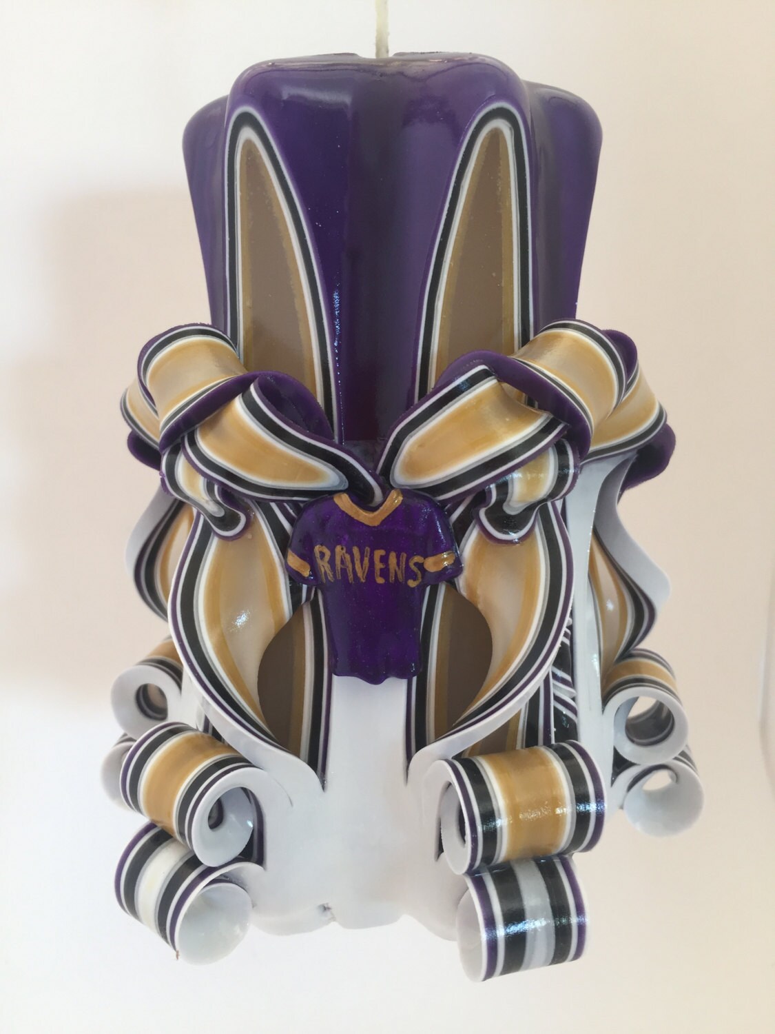 This hand-carved pillar candle is made with a gold center, black accent stripe and a purple exterior, half coated with white wax. It has three embellishments worked into the wax at midpoint: a purple jersey lettered with "Ravens," a black helmet with a gold "B," and a gold and black football. It stands about 5 inches tall and is finished in a high-gloss candle glaze.