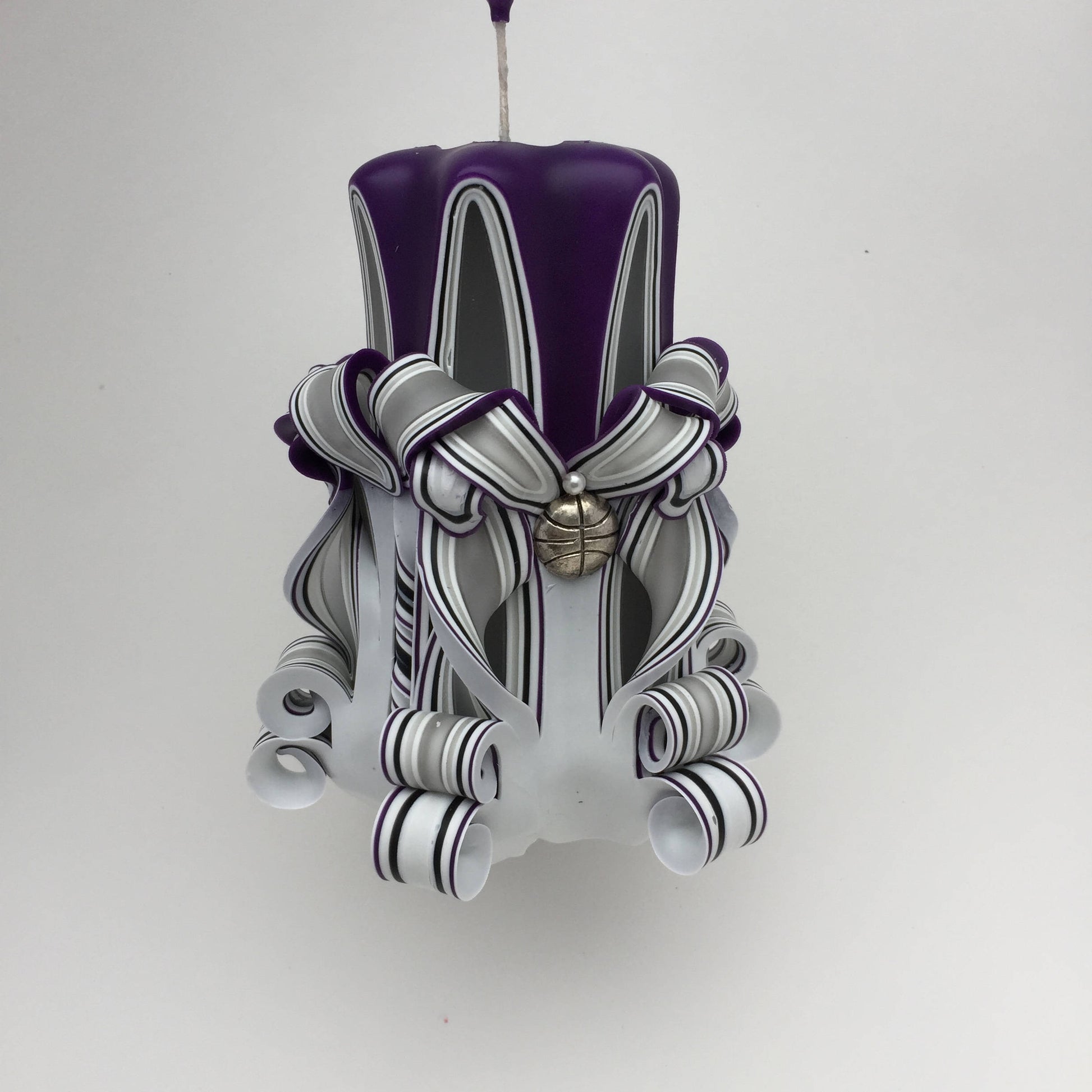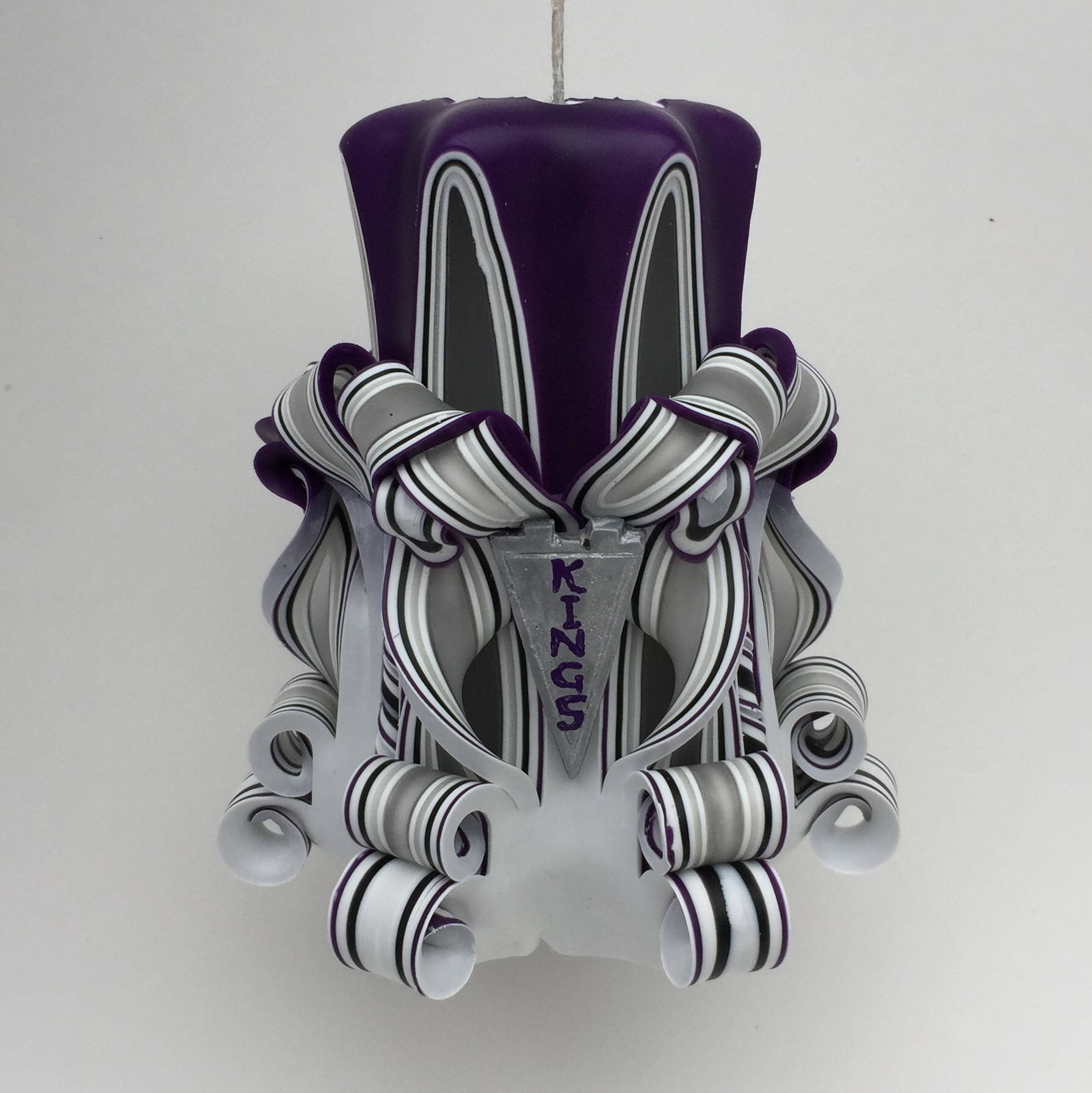 This hand-carved pillar candle is made in the colors of the Sacramento Kings basketball team. It has a silvery gray center, black accent stripe and a purple & white exterior. It has three accent pieces equally spaced around the candle: a purple jersey, a silver basketball and a 'Kings' pennant.