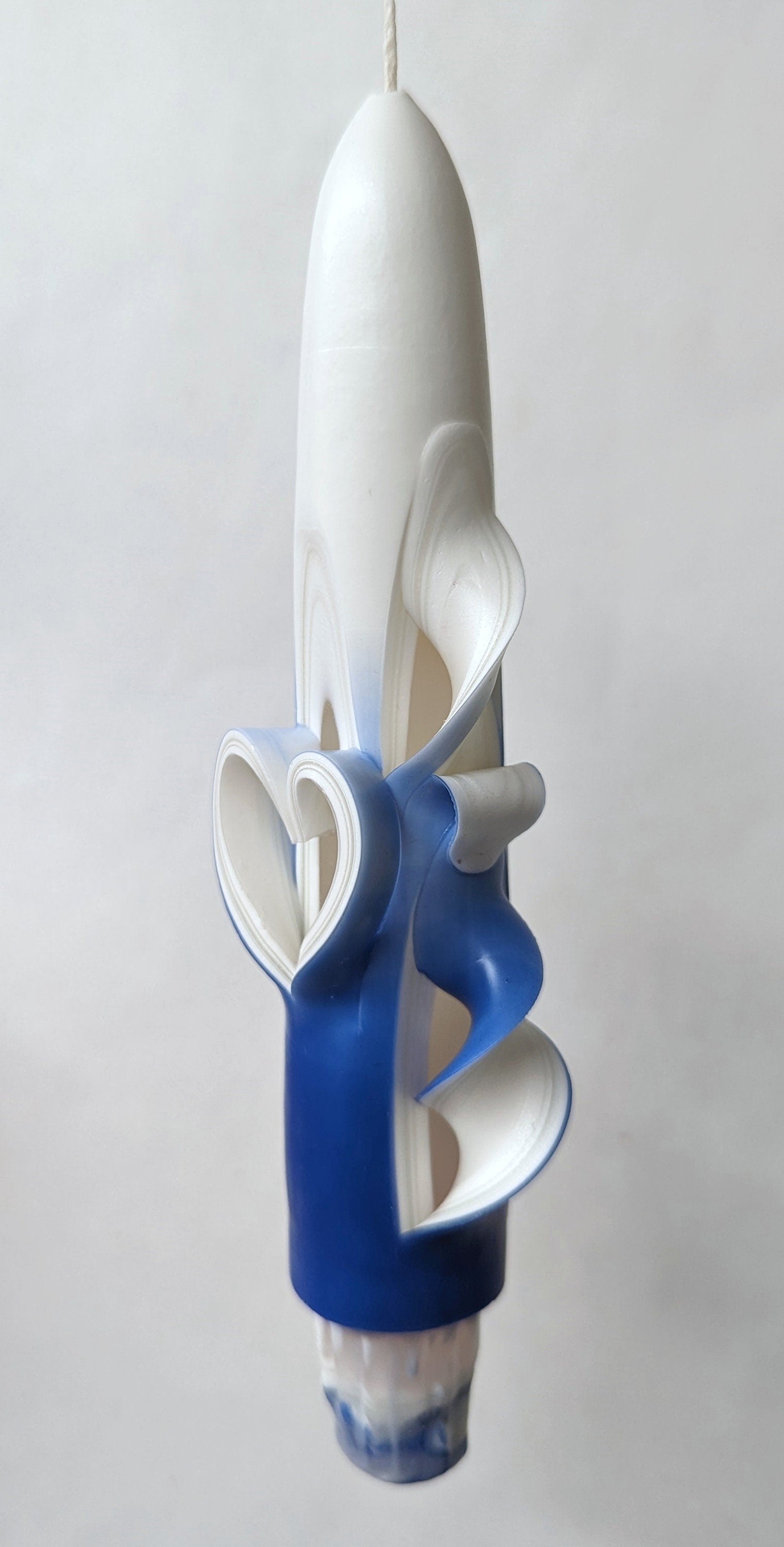 These romantic Valentine heart candles are made with layers of white and clear wax, with exteriors that are shaded from white to dark blue. They feature a hand-carved heart on the center front of each taper.
