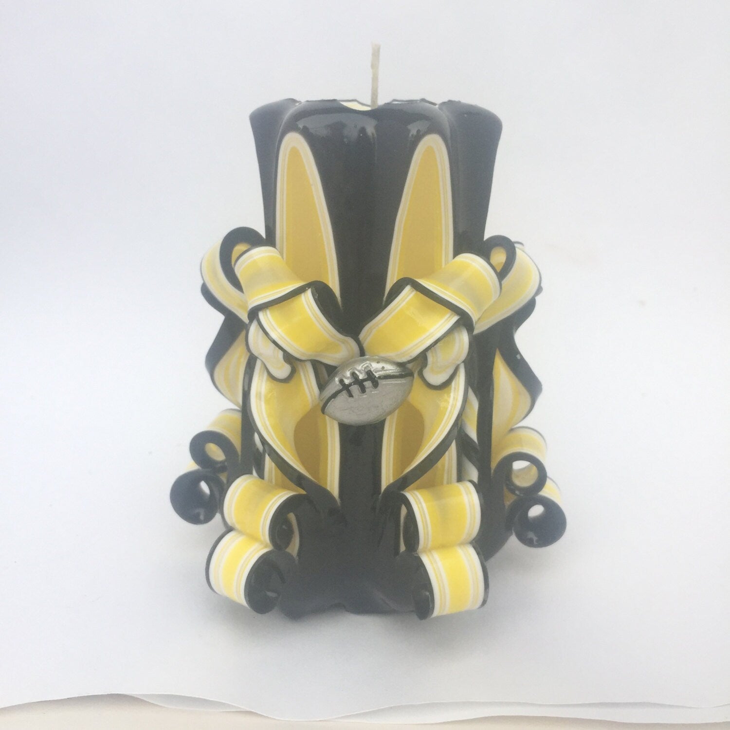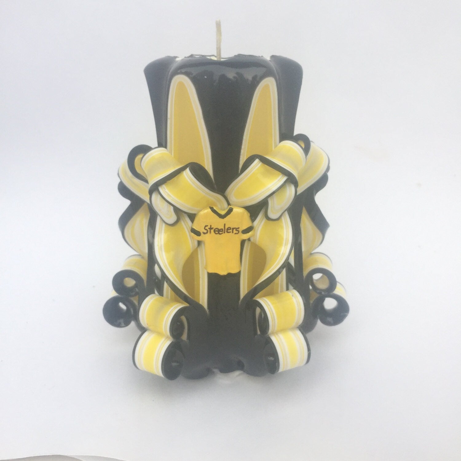 Three piece centerpiece set in Pittsburgh Steelers colors. Pillar is accented with the Steelers' logo, a yellow jersey with "Steelers" lettering and a football. The taper candles each have a football on the front at mid-point.