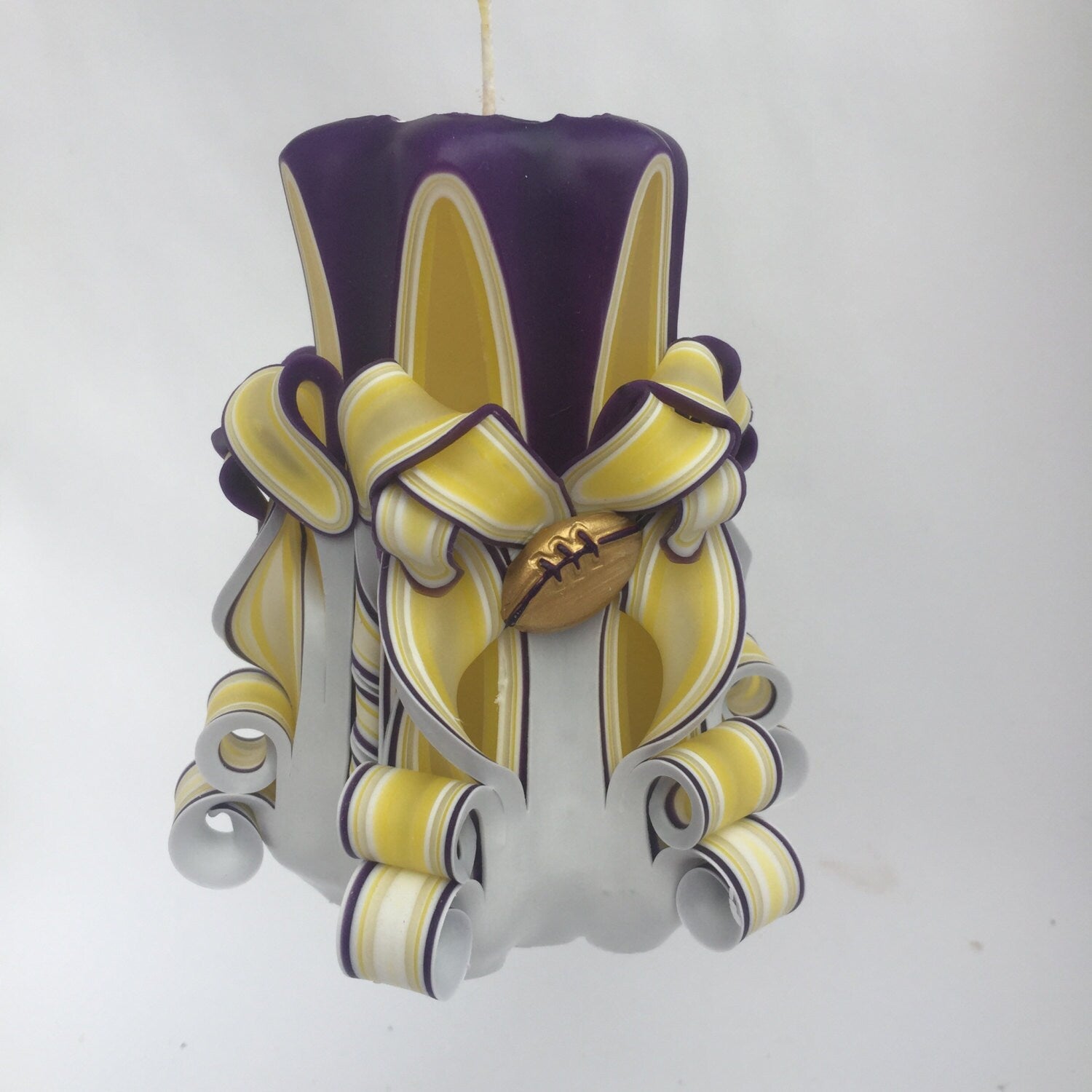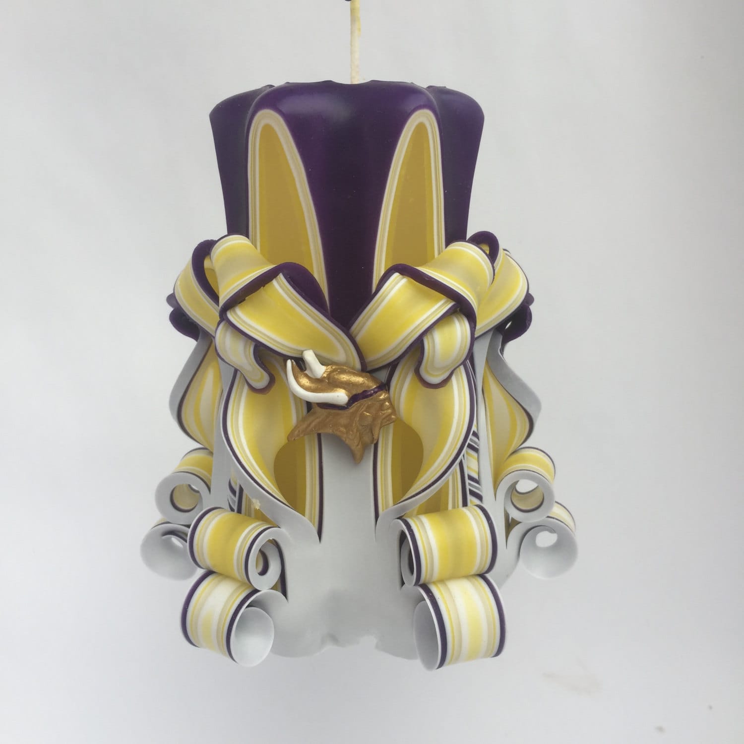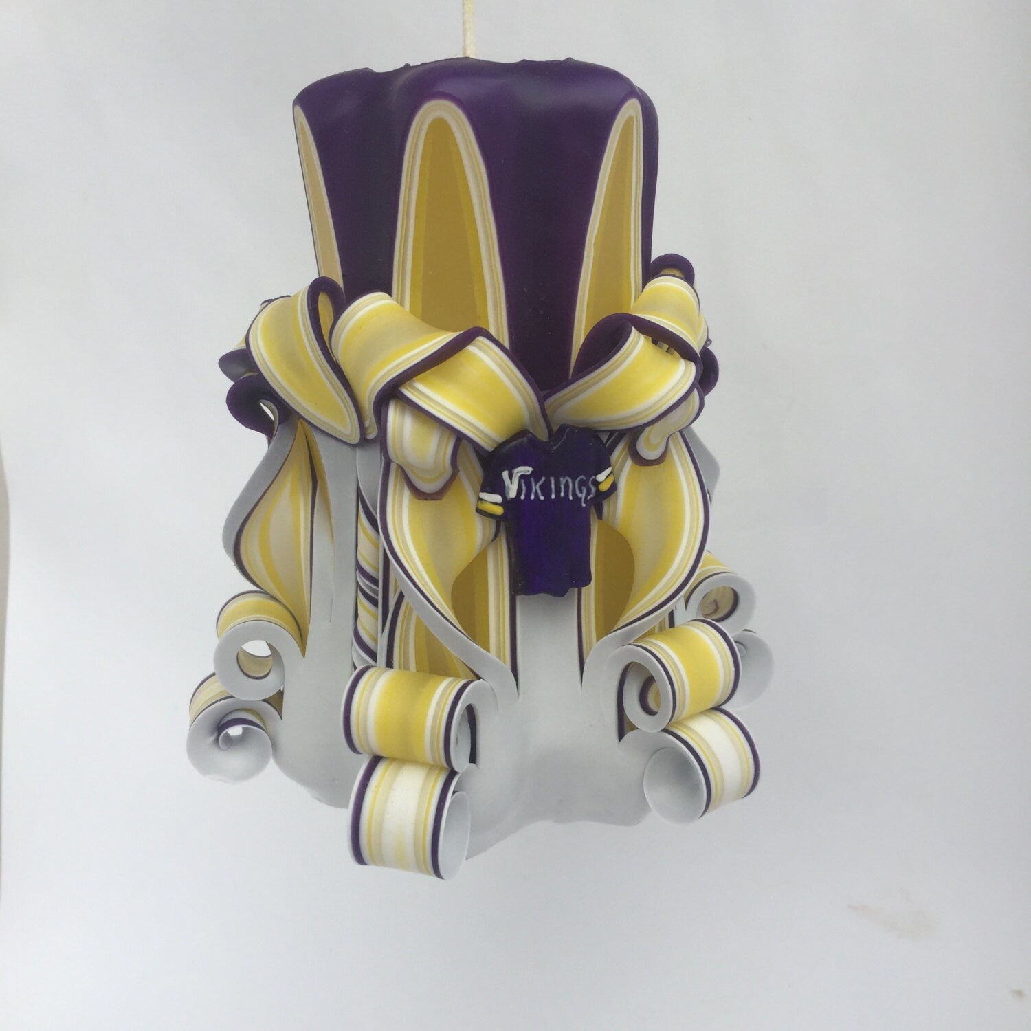 This hand-carved pillar candle is made in the colors of the Minnesota Vikings. It has a golden yellow center and rich purple exterior, half coated with white. It has three embellishments worked into the wax at midpoint: a golden Viking, a jersey lettered with "Vikings," and a gold football.