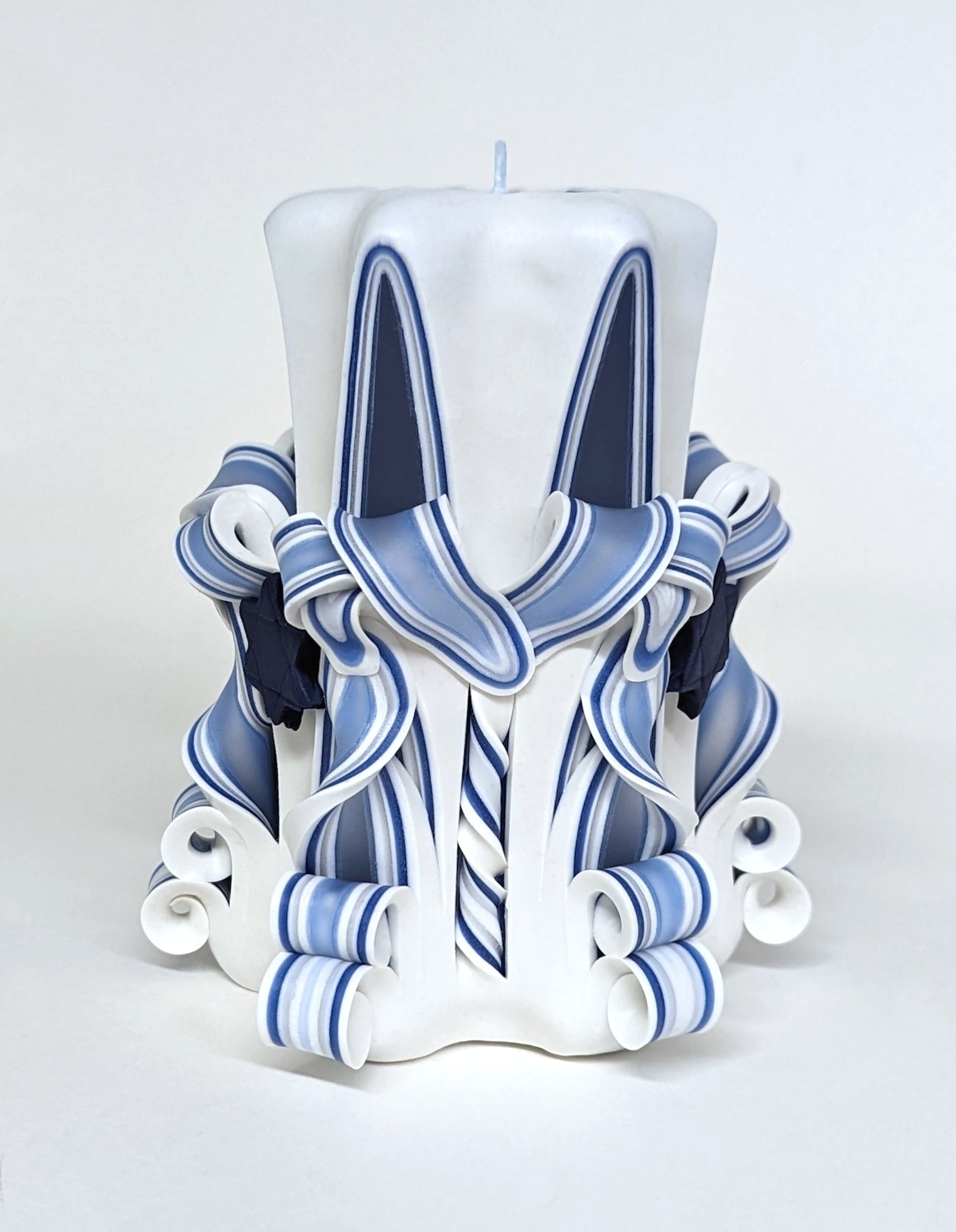 This hand-carved pillar candle is made in varying shades of blue and white and is accented with three Stars of David, equally spaced around the sides of the candle.